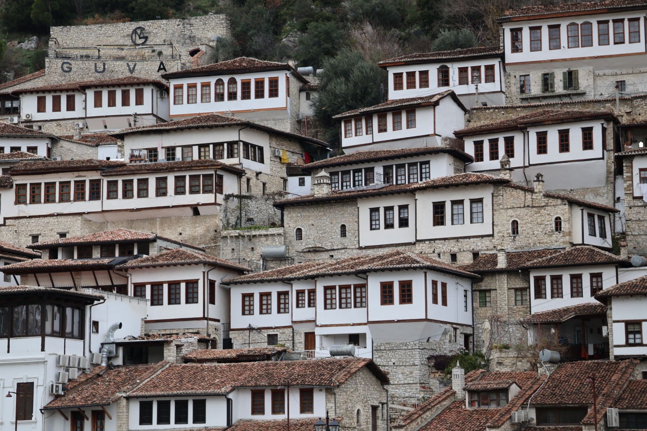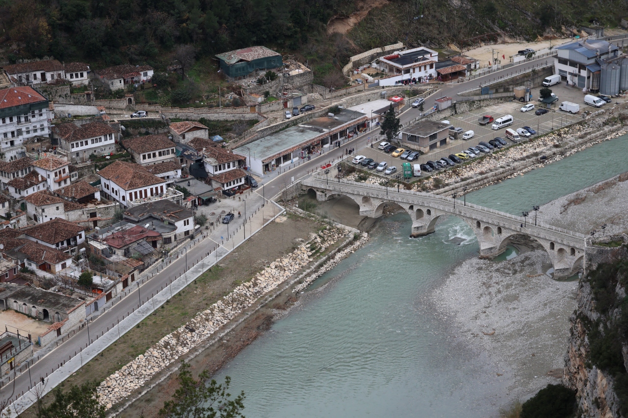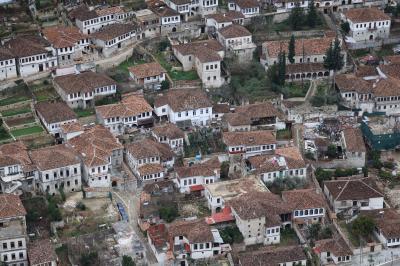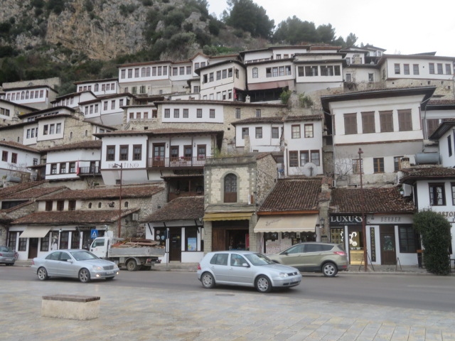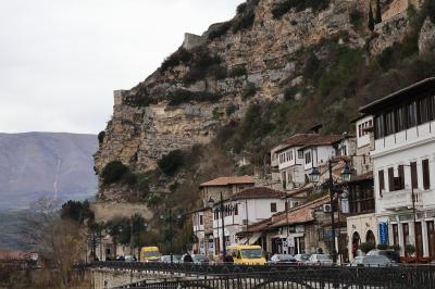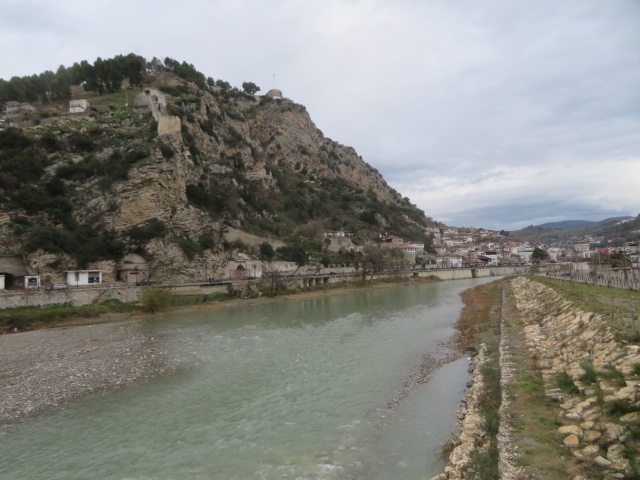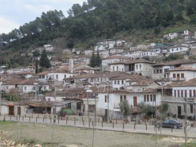 ベラト市街を流れるオムス川沿いにある街並みは千の窓の町として周辺は世界遺産に登録されています、市街の高台にあるベラト城の城塞・城壁を歩いて歴史地区を上から眺めました、素敵な街並みでした、その後、下へ降りてオムス川沿いから街並みを見ました、山の斜面にレンガ色の屋根・白い壁のお家が並んでいます、多くの人が写真に収めていました。