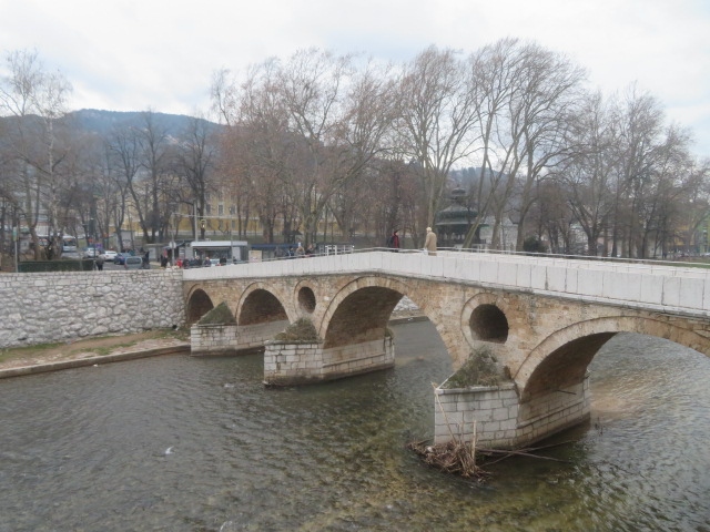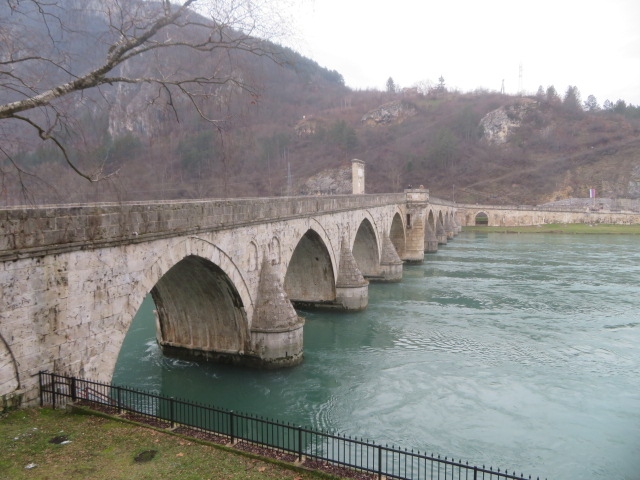 ボスニア・ヘルツェゴビナのセルビアとの国境に近いヴィシェグラードのドリナ川に架かる橋、11のアーチからなる全長175mの橋、オスマン帝国の宮廷建築家だったミマール・スィナンが16世紀末に手掛けた橋で、2007年に世界遺産に登録されています、ドリナ川を眺めながら橋上を歩きました。