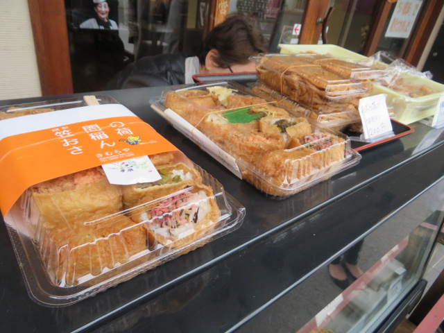 笠間稲荷の参道入口付近にあるそば・うどん・丼物の食堂きむらやの店頭で稲荷ずしを買いました、笠間稲荷の参道や付近では何軒も笠間名物の稲荷ずしを食べさせるお店や販売するお店があります、今回はきむらやで買いました、普通の稲荷ずしから変わったそばが入った稲荷ずしまで10種類ほどの稲荷ずしが並んでいました、普通に食べることが出来ました。