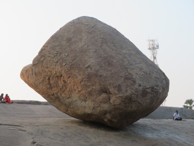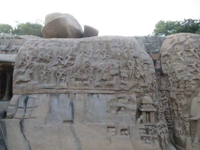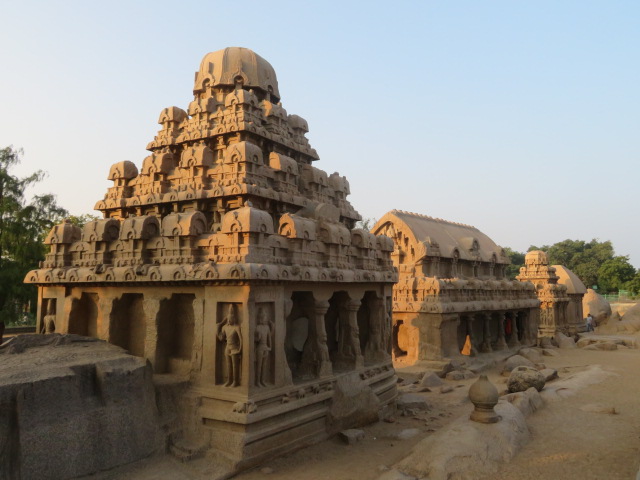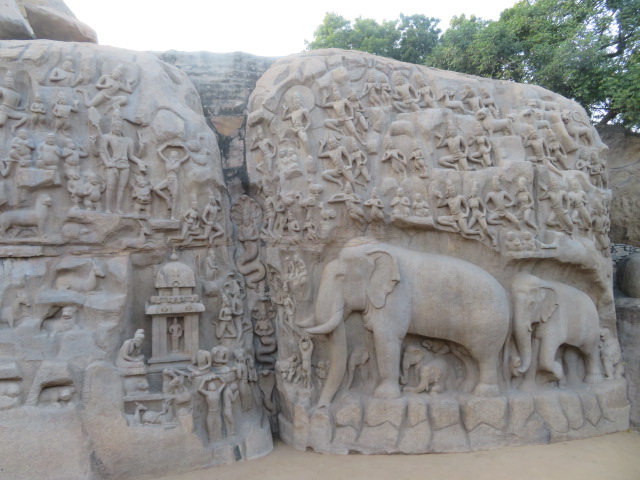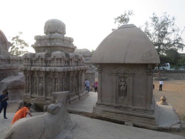 最初にベンガル湾沿いにある海岸寺院に、かつて7つあった寺院にうち2つが残っていて見ることが出来ました、ファイブ・ラタには5つのそれぞれ特徴がある寺院を見ることができました、内部の彫刻を見ることもできます、象や牛の像もあります、広場の一部木陰があり休憩が出来ます、続いてアルジュナの苦行を見ました、岩に彫られた彫刻を見ることが出来ます、大きな象の彫刻が目立ちました、次にそばにあるクリシュナのバターボールに歩いて行きました、坂の途中に転がりそうで転がらない不思議な岩がありました、マハーバリプラムで一番の撮影スポットのようで多くの人が写真を撮っていました、晴れた日は日影が少ないので注意して歩くといいです。- 旅行時期