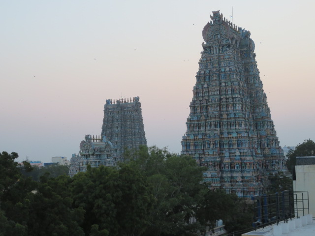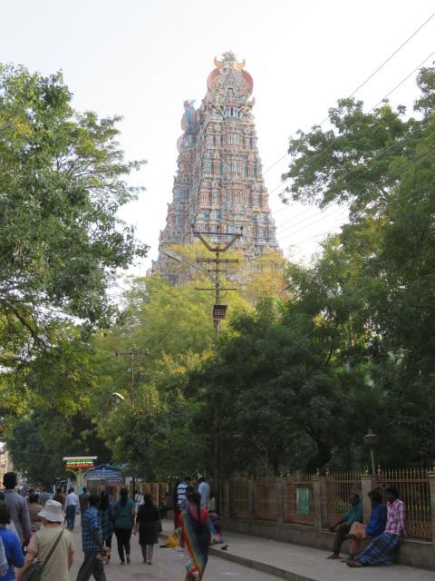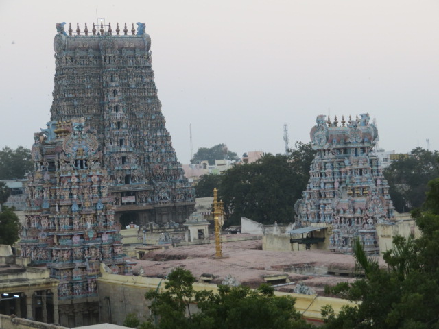 入る前に東門前にある歴史ある建物と宗教グッズを売る商店を見ました、見ごたえがある建物でした、人も多く活気がある場所です、今回北側にあるお土産屋の屋上からミーナクシーアンマン寺院の全景を見ることが出来ました、市街地も見ることが出来ました。- 旅行時期