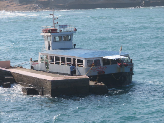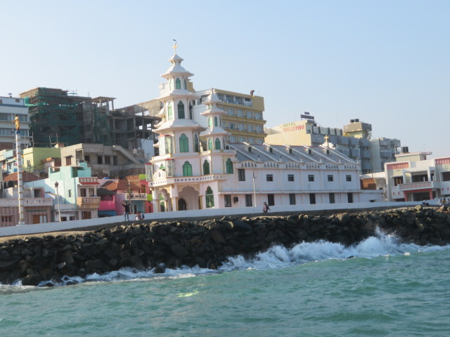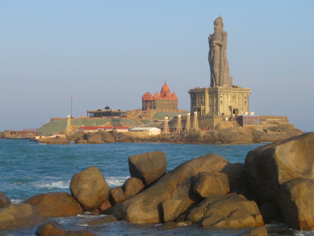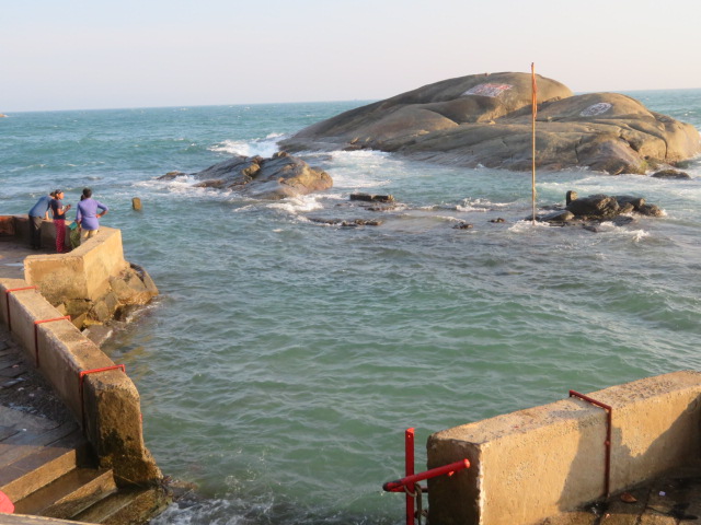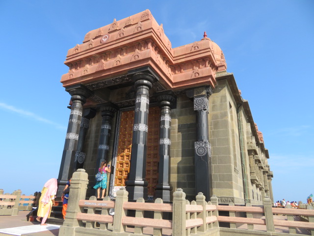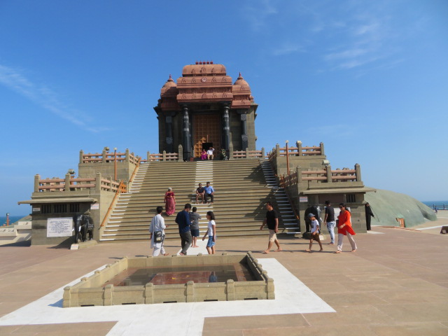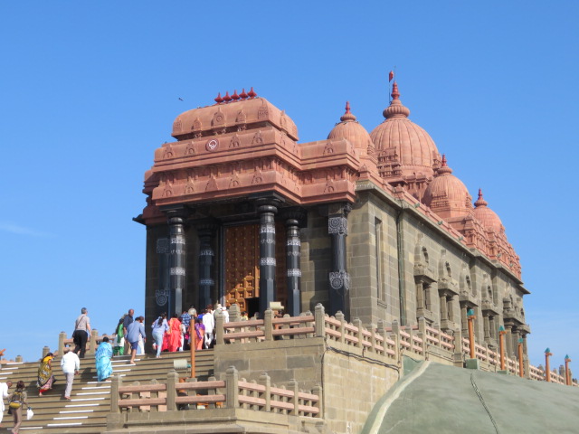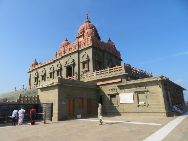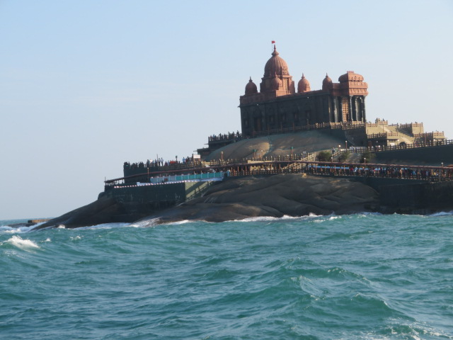 インド最南端のコモリン岬近くのベンガル湾に浮かぶ岩にあります、小さな島に見えますが岩のようです、市街地のボート乗り場から小さなボートに乗船して行きます、乗るまで結構並びました、岩に行く人が多いようです、岩に着くとすぐ上に大きな記念堂があります。