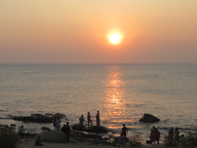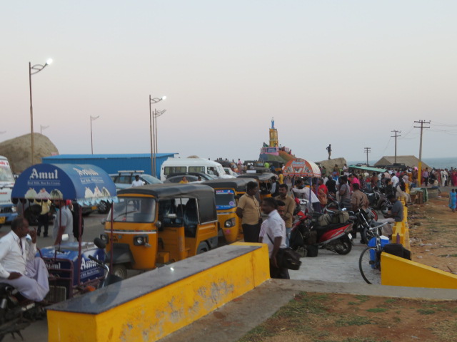 カーニャクマリのコモリン岬から西方向に行ったウエスト・エンド・ビーチロード沿いにある海岸から見ることが出来ました、ロード沿いには多くのオートリクシャや自家用車が停車していて道路が混んでいました、日が落ちる時間には多くの観光客で賑わっていました、殆どの人が日が落ちる場面を写真に収めていました、写真やさんも待機していて安く撮ってもらえるようでした。