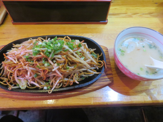 日田のご当地グルメ日田やきそば(650円)を食べました、JR久大本線日田駅から寿通りを西の方に歩いて三本木交差点の角にありました、創業63年の老舗で県内最古のラーメン店のようです、パリッと焼き上げたやきそばです、今回、日田の観光パンフレットについているクーポン券を使ったのでとんこつスープがサービスで付いてきました、一人で行ったのでカウンターを利用して食べました。