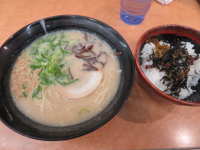 JR博多駅の筑紫口前にある博多ラーメンの食堂です、カウンター席が多いので一人でも気軽に入れます、券売機があるのでそこで食券を買います、今回はお得なランチセットにしました、博多ラーメンとひじきご飯がセットで700円でした、100円プラスで替え玉もあります、昼時は混雑してました、味は私としては普通でした。