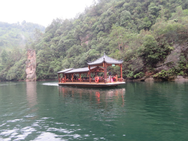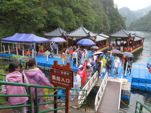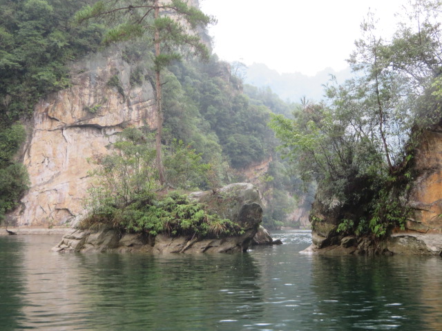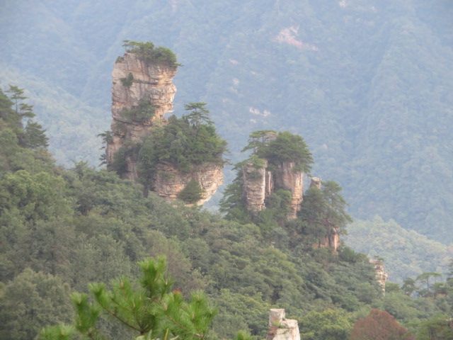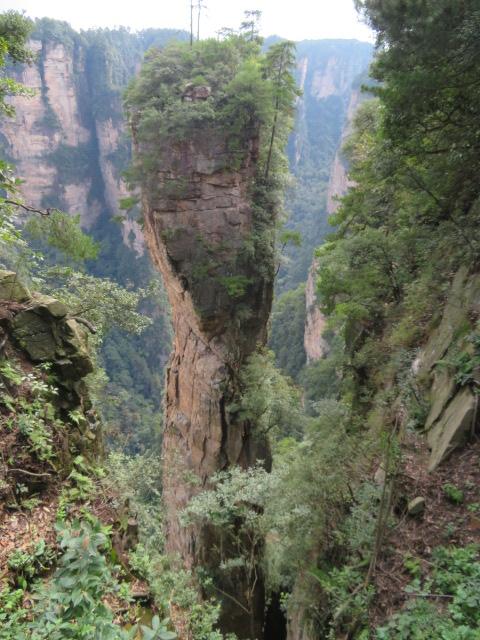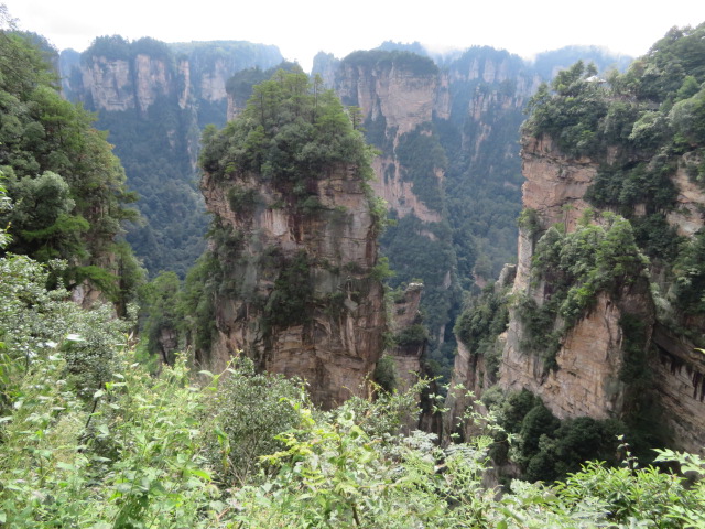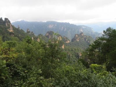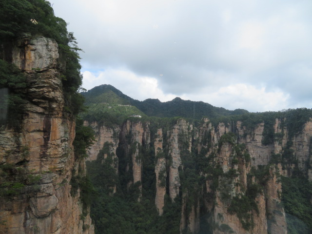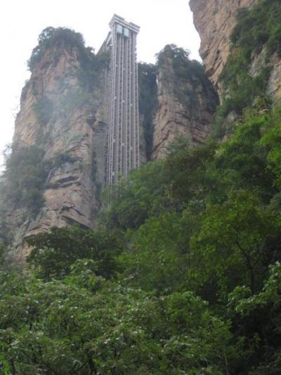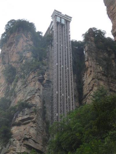 張家界・武陵源景区にある世界一高い野外エレベーターです、ドイツ製で3基並んでいて高さが約330m、絶壁の山肌にあり上に行くとガラス張りから外の風景が見えます、エレベーターの上は袁家界景区で迷魂台・天下一橋に行く散策路がありいつも多くの人が来ています、ツアー案内の写真で何回も見たエレベーターに乗れて良かったです。