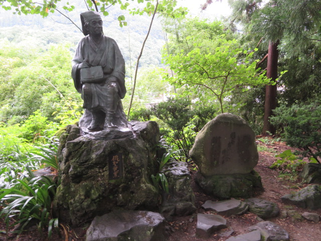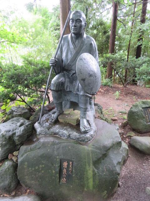 俳人芭蕉と弟子の曽良が奥の細道で立ち寄った山寺・立石寺、その本堂である根本中堂の西側に像があります、閑かさや岩にしみ入る蝉の声と詠んだ俳人芭蕉のゆかりの地に昭和47年に芭蕉の像、平成元年に同行した曽良の像が誕生しています、間には芭蕉の句碑があります、像は山寺ではここだけにあります。