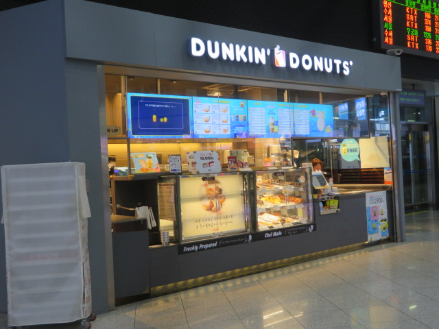 KTX釜山駅前の東横インに宿泊したので、夜食用に駅1階にあるダンキンドーナツで買って持ち帰りました、ダンキンドーナツは韓国内でよく見かけます、駅構内にはミスタードーナツもありました、1個1200ウォン位からあるのでお手頃なおやつ・夜食です、味も間違いないので何回か買いました。