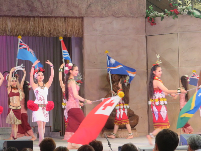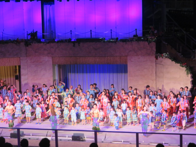 ウォーターパーク・ビーチシアターで行われるポリネシアン・サンライトカーニバルは約50分間見て楽しみました、タヒチ、ニュージーランド、サモア、イースター島、ハワイの踊り、フラガールの華麗な踊り見事でした、途中、子供達が参加できるコーナーもあり来場者が喜んでいました。
