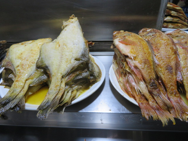 今回はその通りにある大鮮サシミ屋に入りました、店頭に並んでいる焼き魚から好みの魚を選んで食べることができます、今回はカレイを選びました、店内で待っているとキムチなど7~8品の付け出しとスープを用意した後、メインの魚を出してくれました、ゆっくり落ち着いて食べることができました、料金は他のお店とほぼ同じようです。- 旅行時期