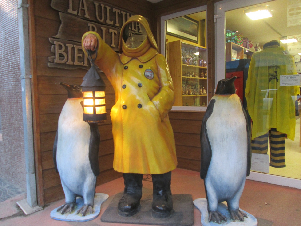 入口にペンギンと人間の像が3体立っています、思わず写真を撮ってしまいました、店内は広くTシャツなどの衣類、バック類、民芸品、お菓子などお土産が多くあります、種類が豊富にあるので面白いです。- 旅行時期
