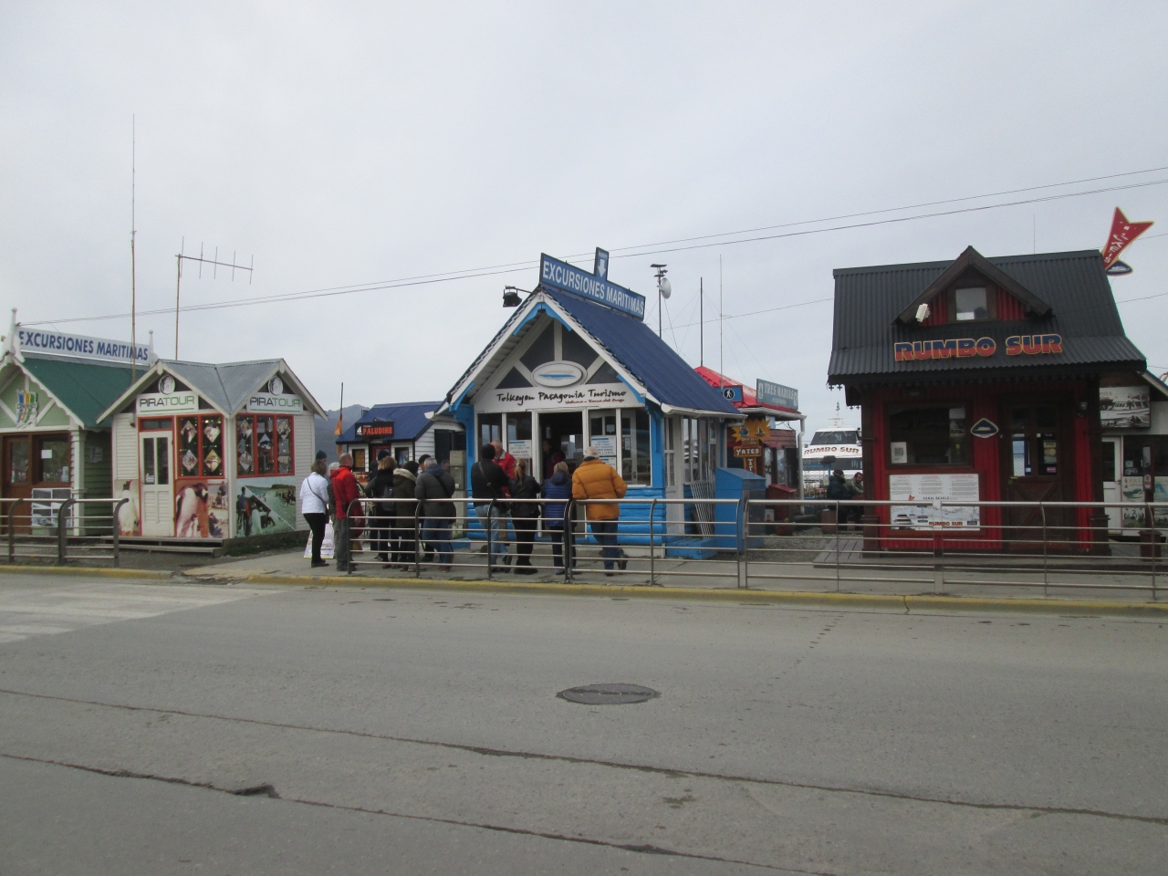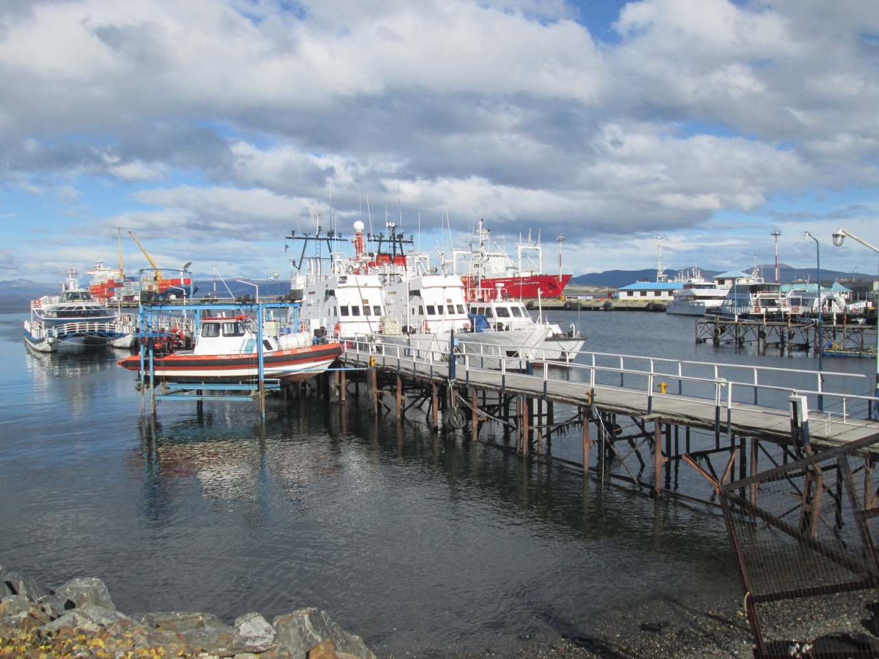 南部パタゴニアの世界最南端の街・ウシュアイアの港にある観光桟橋、ここからウミウ、オタリア、ペンギンなど見て楽しめるビーグル水道クルーズが始まります、私もここをクルーズ発着時に利用しました、いつも桟橋にはクルーズ船が停泊しています、他に南極へ行く大きな船や貨物船も停泊していました。