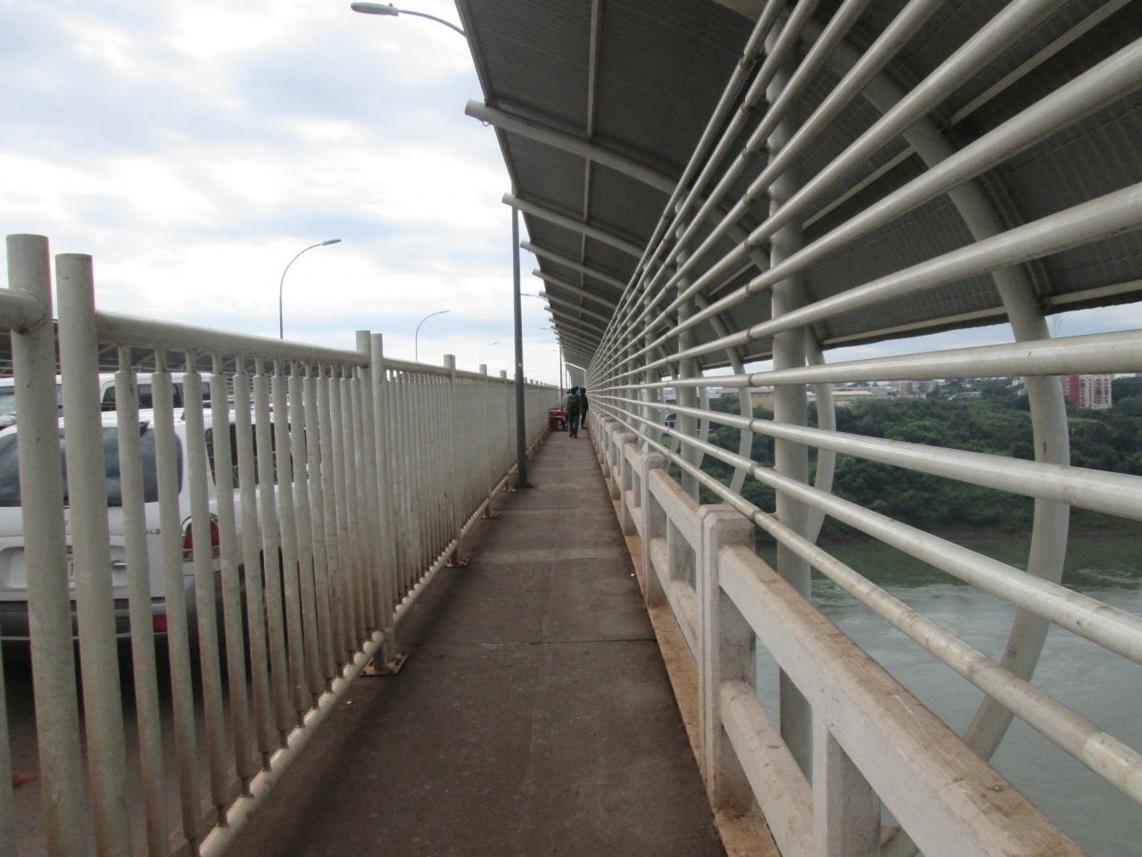 ブラジル側のフォス・ド・イグアスのホテルからタクシーを利用してパラナ川に架かる友情の橋を渡りました、橋の手前でブラジル出国手続きをして橋を渡ってパラグアイの税関で入国、帰りは歩いて渡りました、手続きはパラグアイの税関で出国手続き、ブラジル側で入国しました、橋は約10分で渡ることが出来ました、道路上は混雑してましたが歩道は空いていました、国境を歩いて越える経験もいいですね。