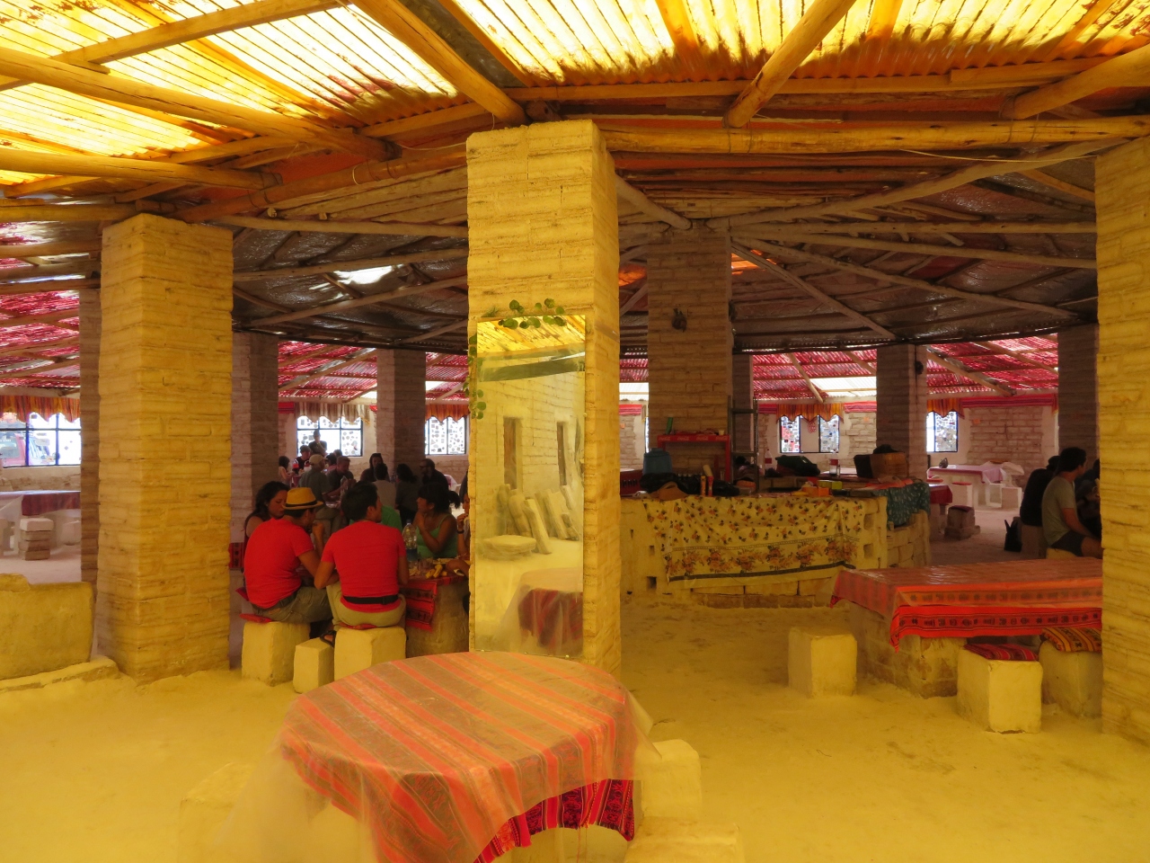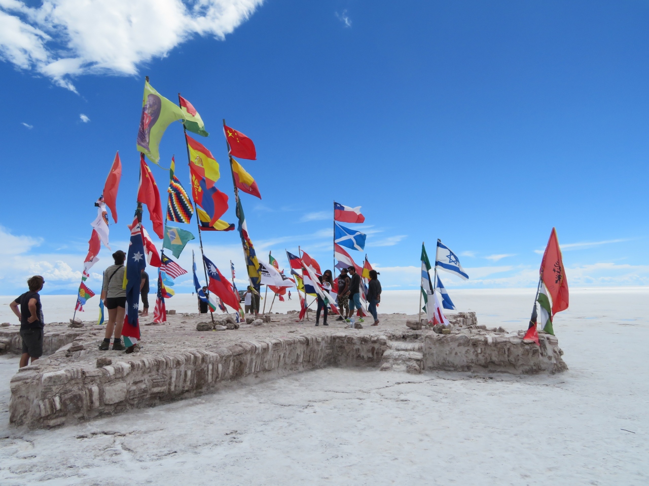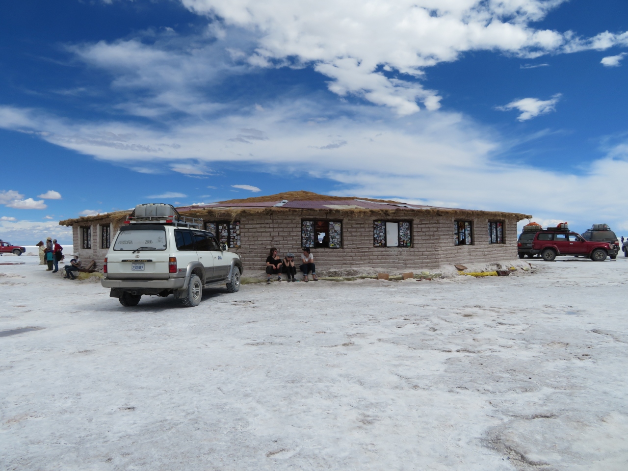 ウユニ塩湖の真ん中にあり、塩湖ツアーで多くの人が立ち寄りで利用することが多い施設です、一応塩でできたホテルです、ここで休憩、食事をする人で賑わっています、ホテル内には塩でできたオブジェや売店があります、ホテル前には各国の国旗があり、大きな塩のモニュメントもありました。