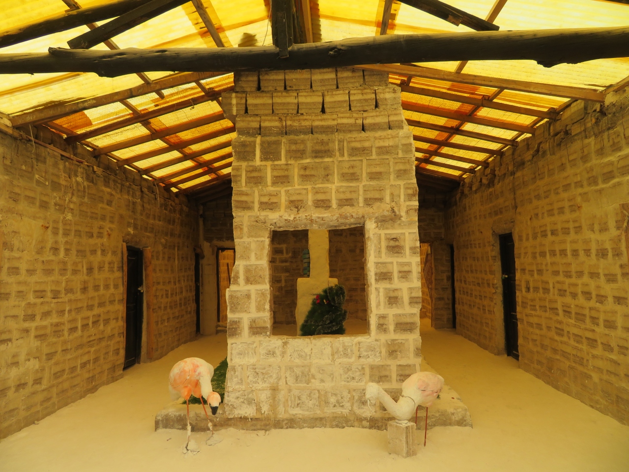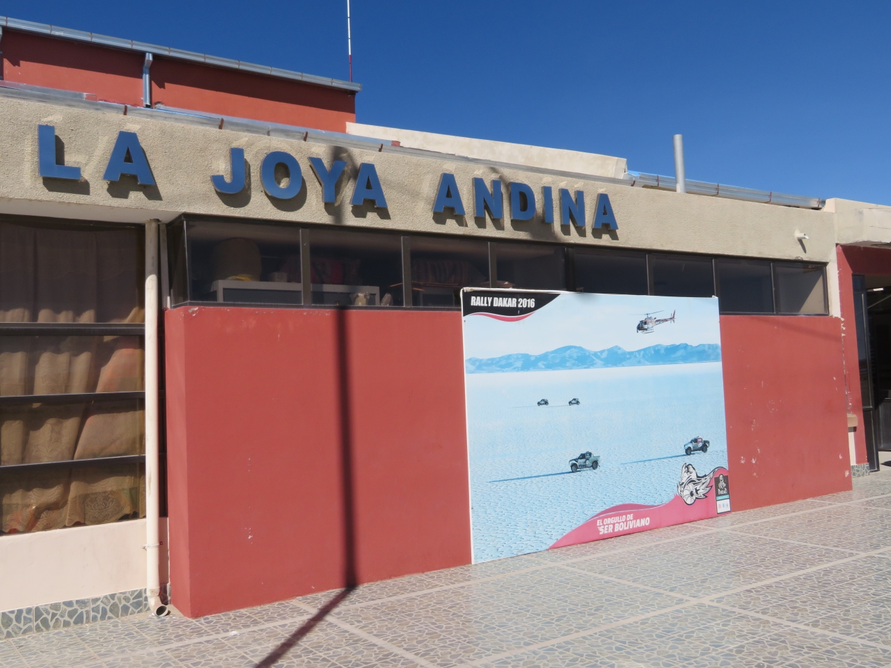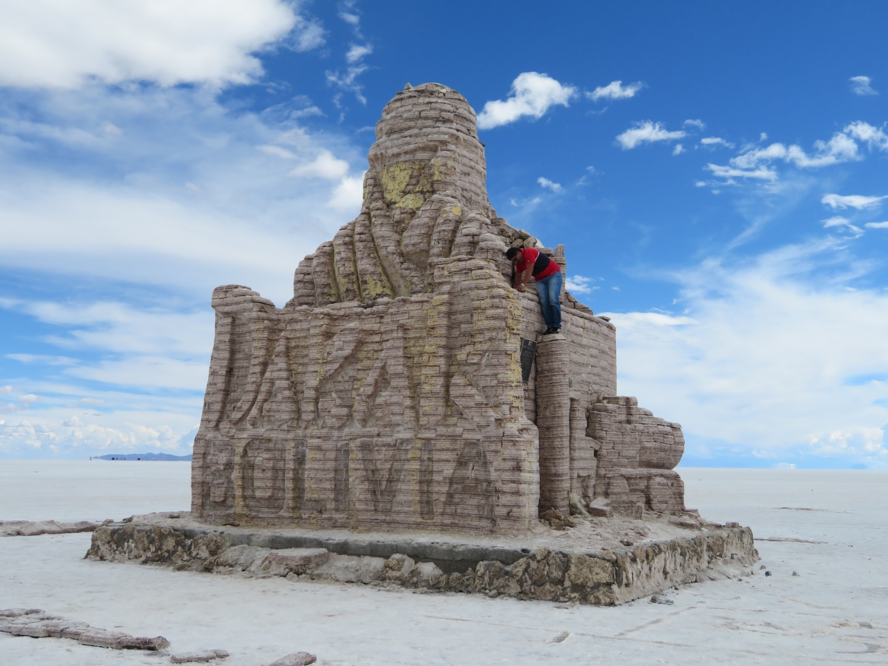 ウユニ塩湖の真ん中にあり、塩湖ツアーで多くの人が立ち寄りで利用することが多い施設です、一応塩でできたホテルです、ここで休憩、食事をする人で賑わっています、ホテル内には塩でできたオブジェや売店があります、ホテル前には各国の国旗があり、大きな塩のモニュメントもありました。
