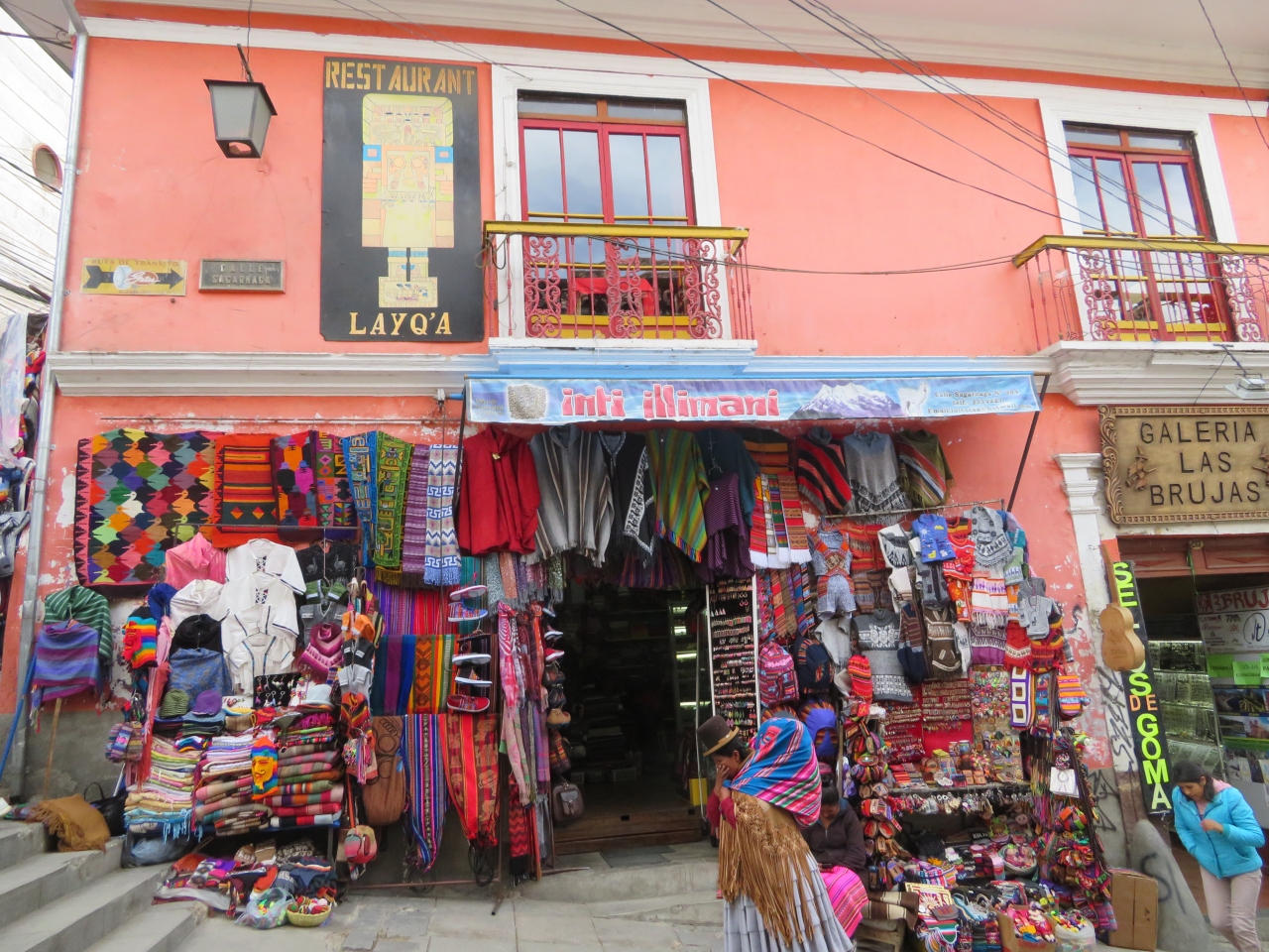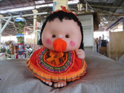 大通りのサンタクルス通りにあるサンフランシスコ寺院の横からサガルナガ通りが始まります、ゆるい登坂道の両側に民芸品や楽器を扱うお店が並んでいます、カラフルな色をした衣類やお人形が店内に置かれていました、又、通りには露店も出ていて同じようなものが売られています。