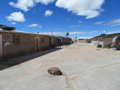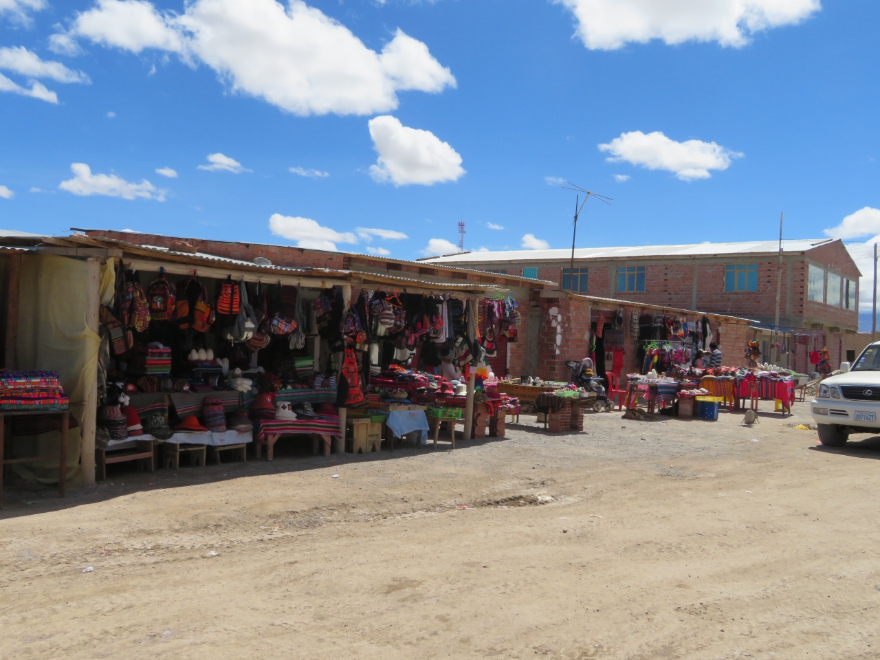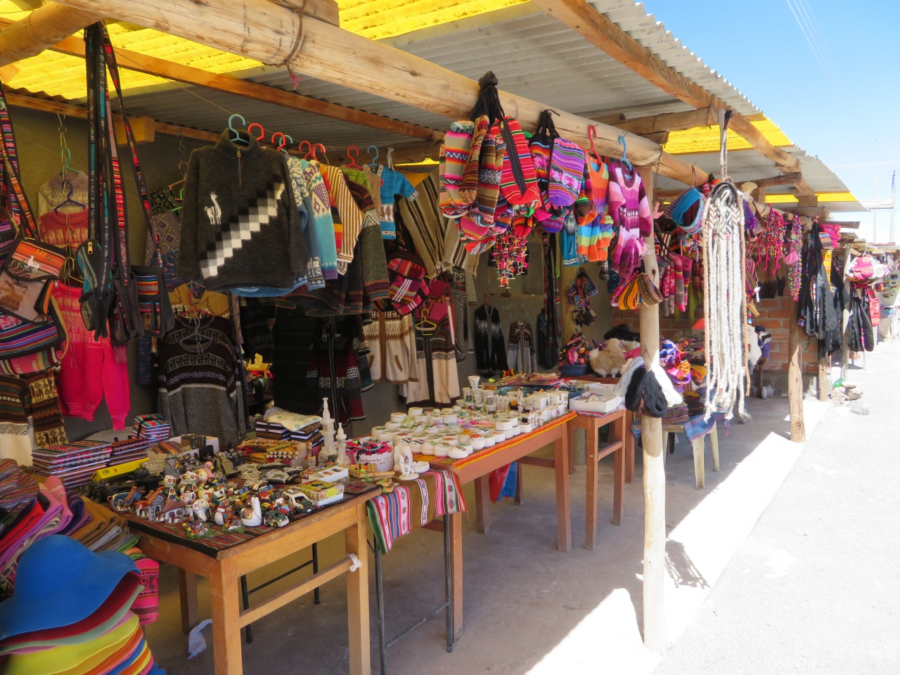 ウユニ市街や空港からウユニ塩湖に行く途中にあります、ツアーなどが立ち寄る場所です、大通りから非舗装の道路を入るとある集落にありました、民芸品店が広場の両側に並んでいます、そばには塩を精製工場もあり直売もしていました。
