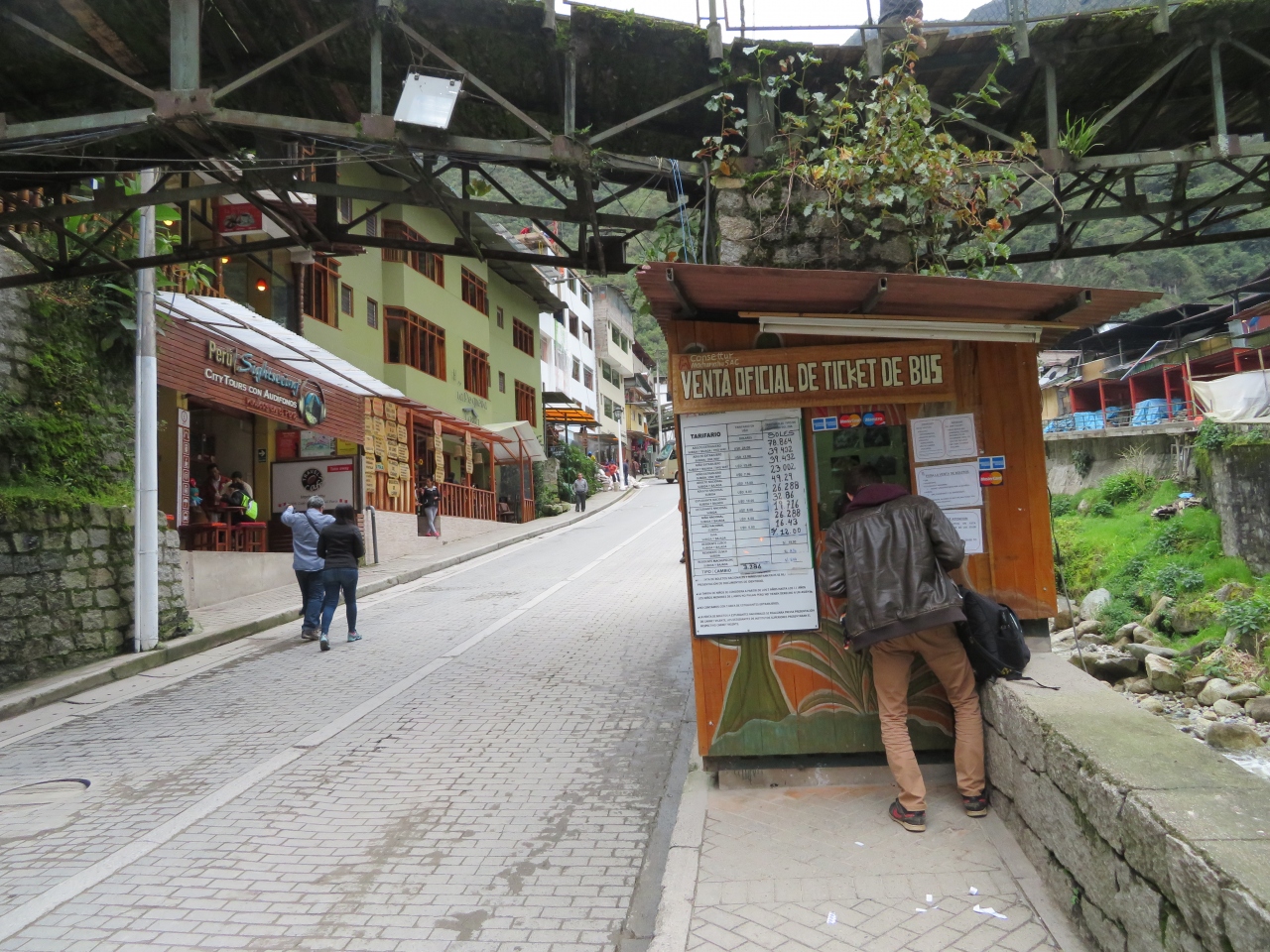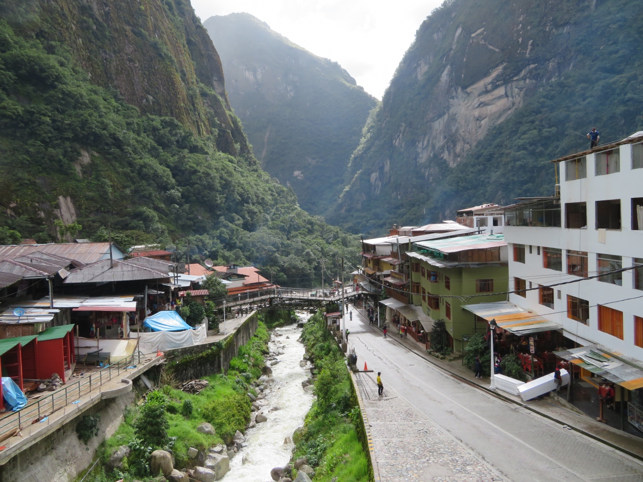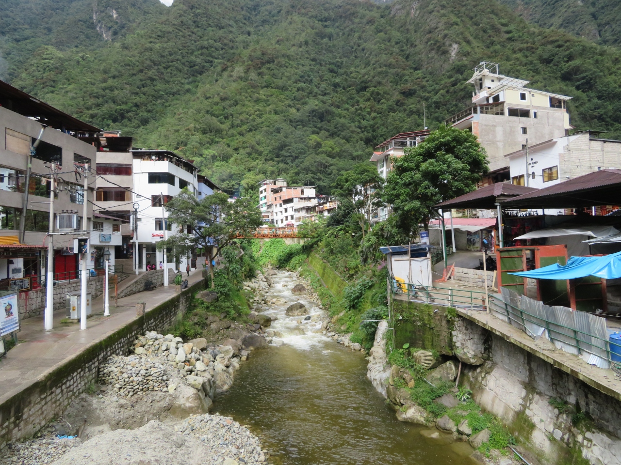ペルーレイルのマチュピチュ駅を降りるとマチュピチュ村の市街地に入ります、村といっても農村とは違います、世界遺産のマチュピチュ遺跡へ行く入口に広がる街です、中心にアグアス・カリエンテス川が流れていて両側に街並みがあります。