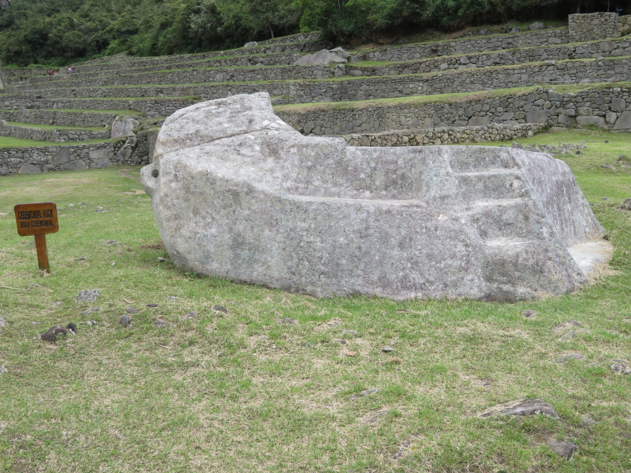 マチュピチュ遺跡群の神聖な広場、主神殿を見た後高台に向かい、一番高い場所に高さ1.8mの日時計がありました、ここからは周辺の眺望が楽しめました、ここはインカの人達が暦を読むために日時計として利用していたようです。