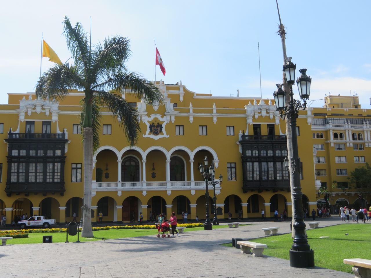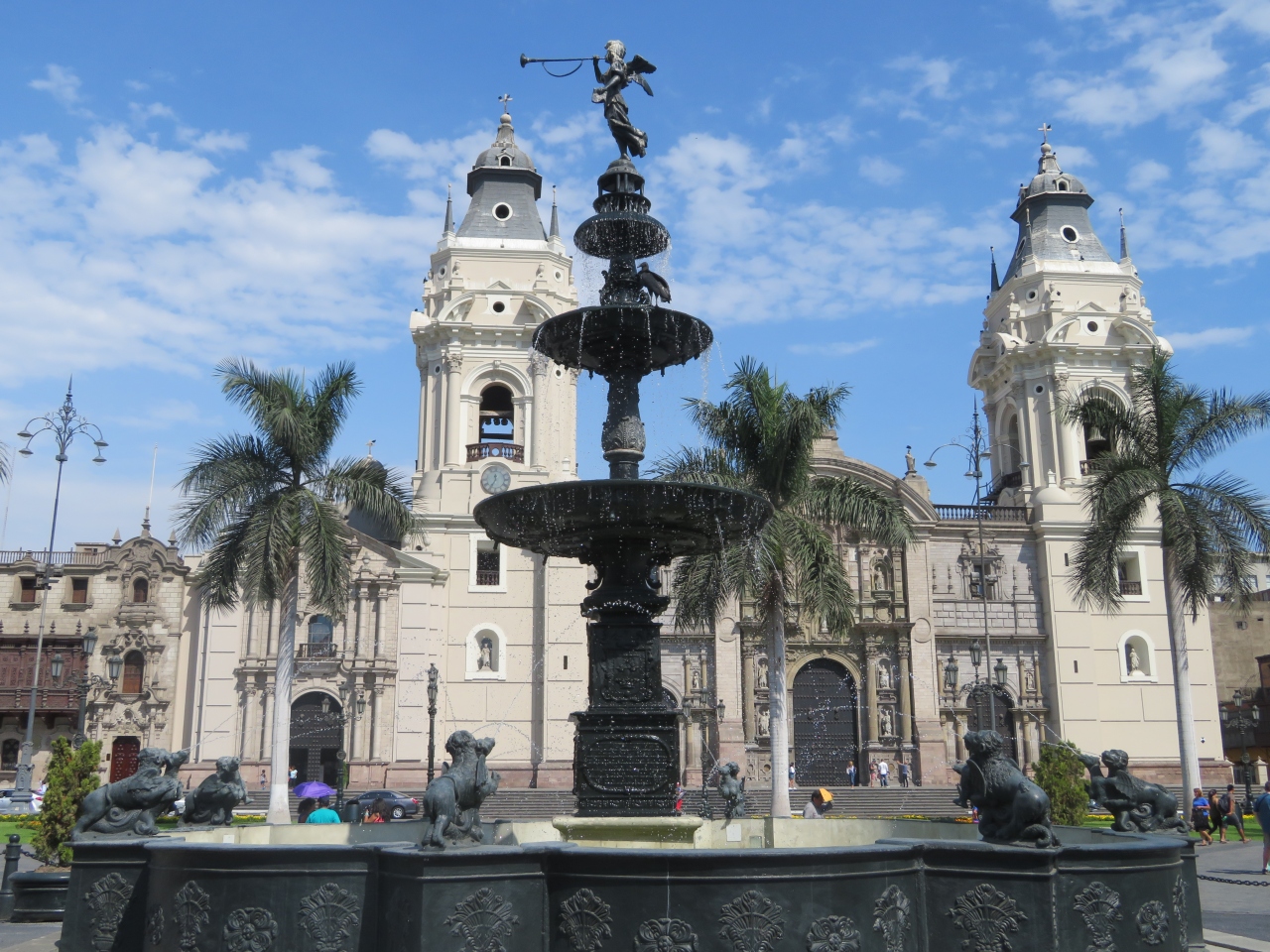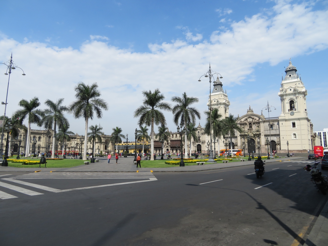 リマの旧市街・セントロにある大きな広場、サン・マルティン広場からラ・ウニオン通りを歩いてアルマス広場に行きました、広場の周りには古い建物が残っています、大統領官邸、市庁舎、カテドラルなどがあります。