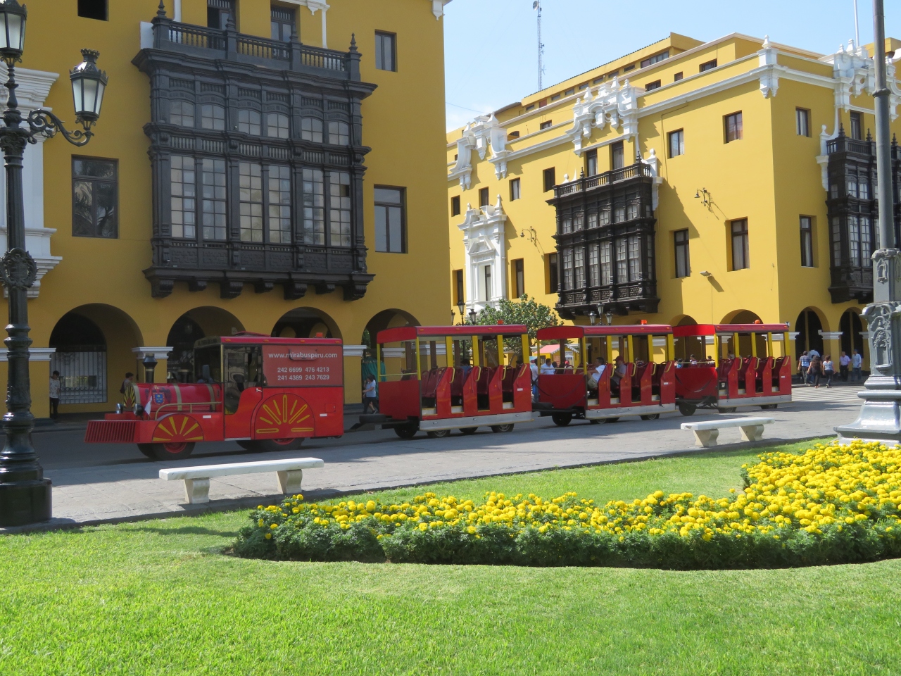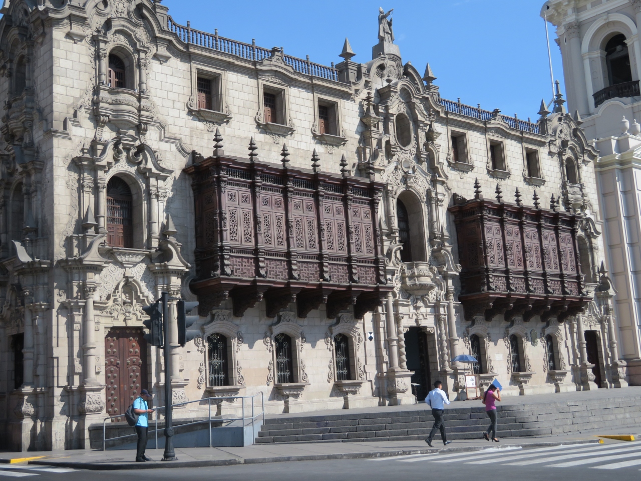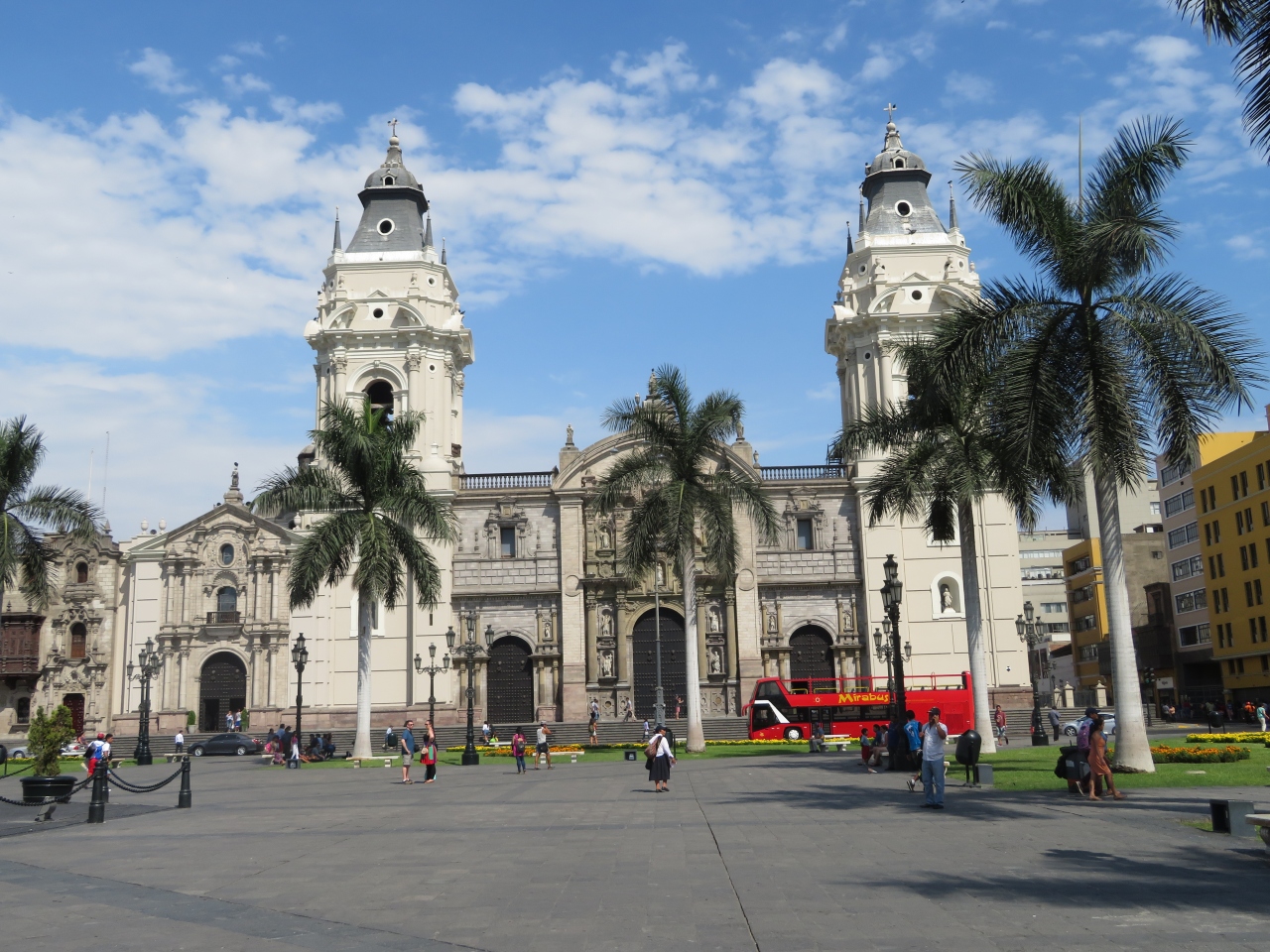 リマの旧市街・セントロにある大きな広場、サン・マルティン広場からラ・ウニオン通りを歩いてアルマス広場に行きました、広場の周りには古い建物が残っています、大統領官邸、市庁舎、カテドラルなどがあります。
