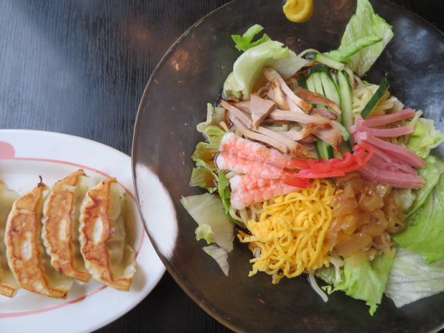 私はしょうゆダレの冷し中華を、連れはごまだれの冷し中華を、いずれも餃子と一緒に食べました、味はそこそこ美味しかったです、餃子も良かったです、夕方早い時間でしたので人が少なくゆっくり落ち着いて食べることが出来ました、これからの季節また食べる予定です。- 旅行時期