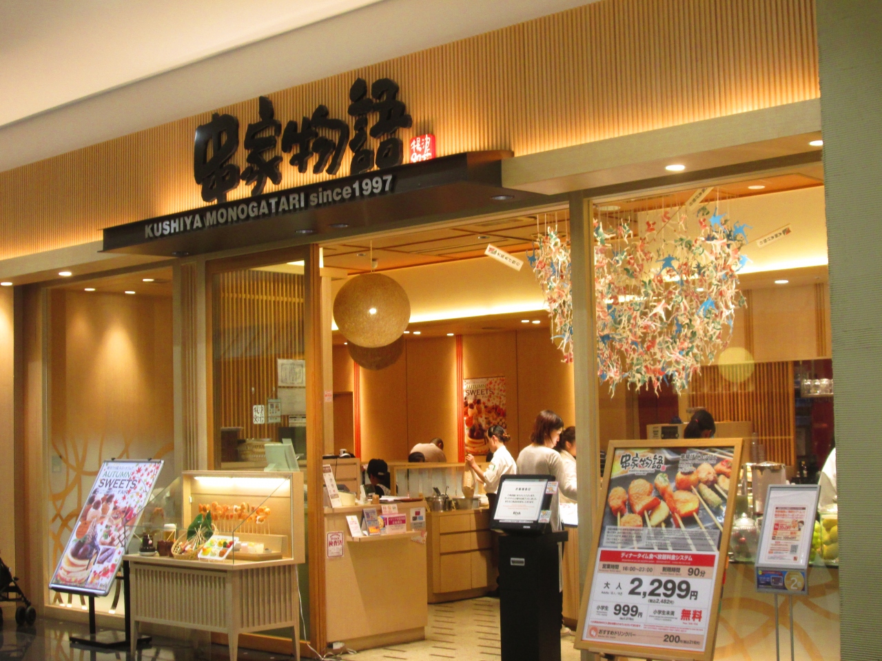 イオンモール春日部の1階レストラン街にある串焼きビュッフェのお店、お昼のランチタイムに利用したので1600円位で食べることができ満足でした、野菜やお肉などの串焼きが自由に選べて、自分で好みのあげ具合で食べられます、ソースも好みの味を選べます、デザートも果物、プチケーキなどありました、ディナータイムですと500円位高くなるようです。