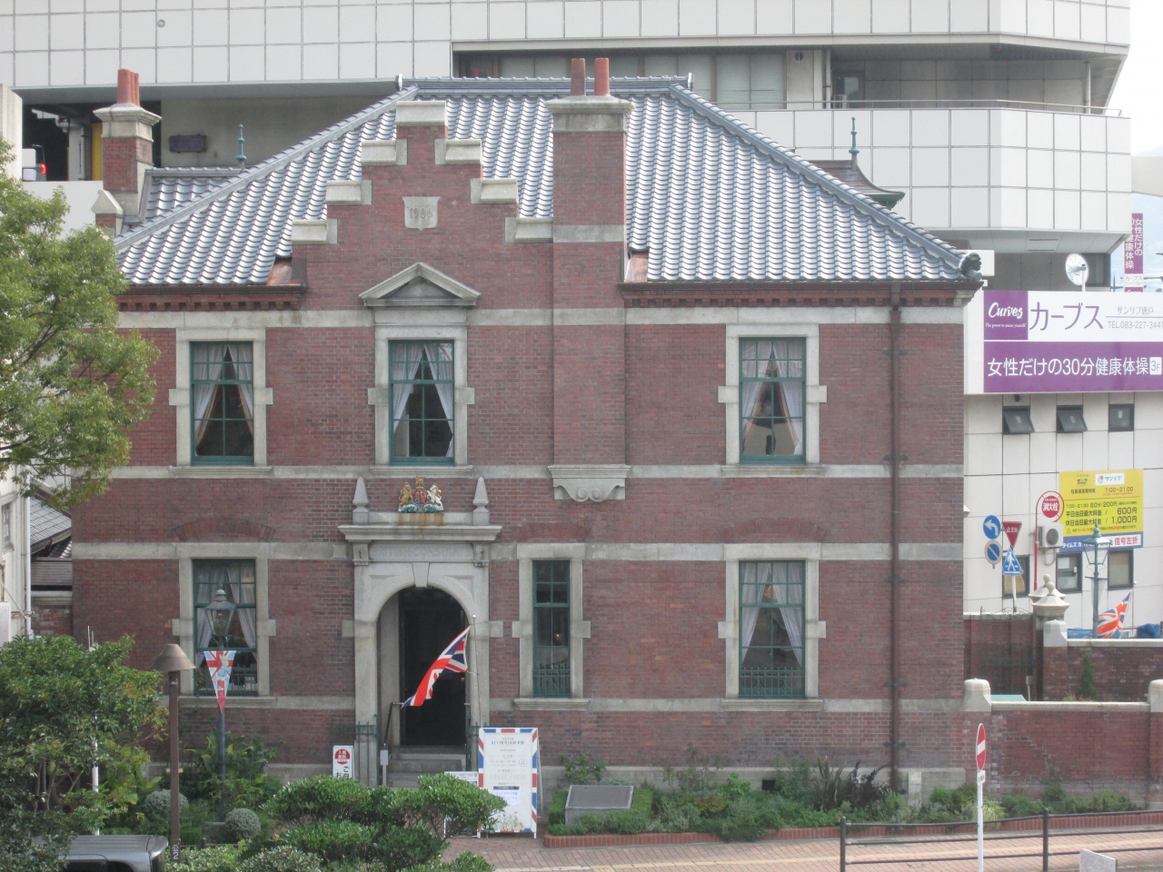 唐戸地区の中心にある領事館として使用する目的で建設された建物としては日本最古、明治39年(1906年)に建設されました、現在は1階に当時を再現した領事室、2階に英国風カフェ・パブと附属屋ギャラリーがあります、1階にはショップもあります、外から見て、ノスタルジックな雰囲気を楽しみました。