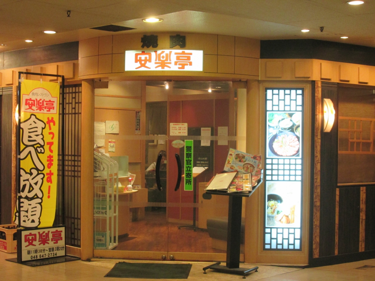 焼肉チェーンの安楽亭で、大宮駅東口南銀座の商店街にあるお店でビルの2階にあります、ランチタイムが午後5時までなのがうれしいです、ランチタイムのサービスメニューファミリーカルビは637円、豚カルビは853円でお手頃価格がうれしいです、デザートはいろいろあり、270円からアイスクリームがあります。