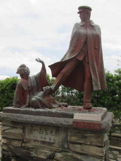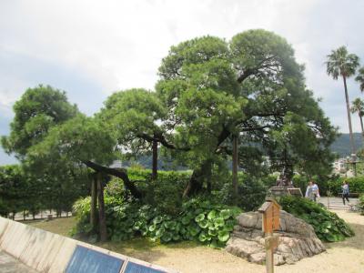 国道135号線にあるお宮緑地にある松と銅像です、金色夜叉の貫一とお宮との名場面を再現した銅像です、夜はライトアップされているようです、熱海の海岸で最も人気がある観光スポットで多くの人が撮影しています、そばにある金色夜叉の碑とともに見ることが出来ます。