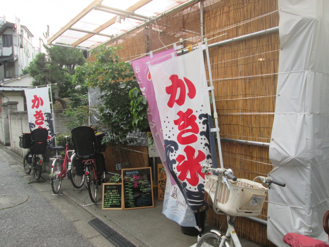東武スカイツリーラインの梅島駅から梅島駅前通り商店街を西の方に歩いて約15分、ショッピングタウンカリブの先の住宅街にあります、テントとテーブルがあり奥に注文をする場所があります、日光松月氷室の天然氷を使用した美味しいかき氷です、かき氷の種類も豊富で安い昔ながらのシロップを使用したかき氷から旬の果物を使用したちょっと高めのかき氷まであります。