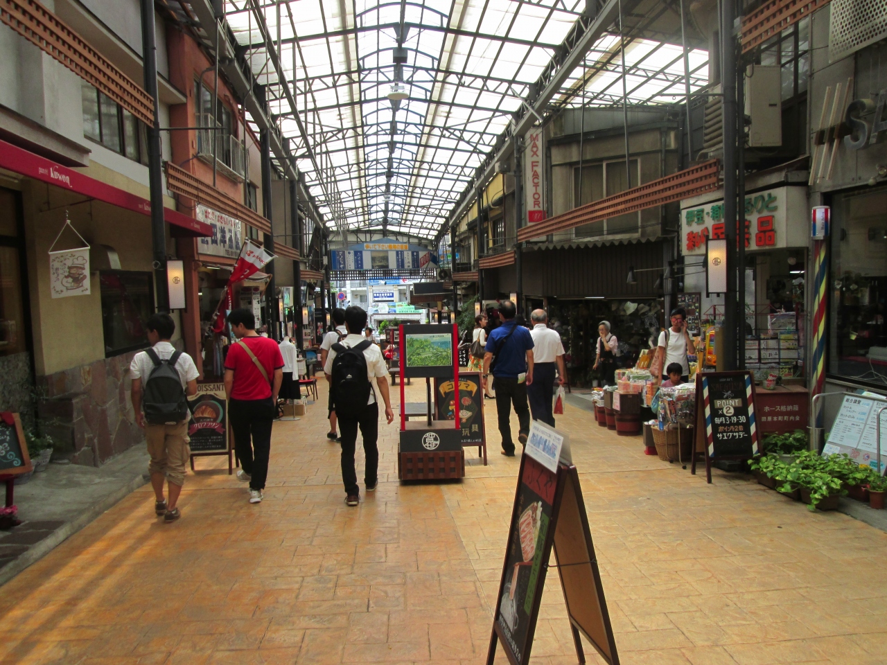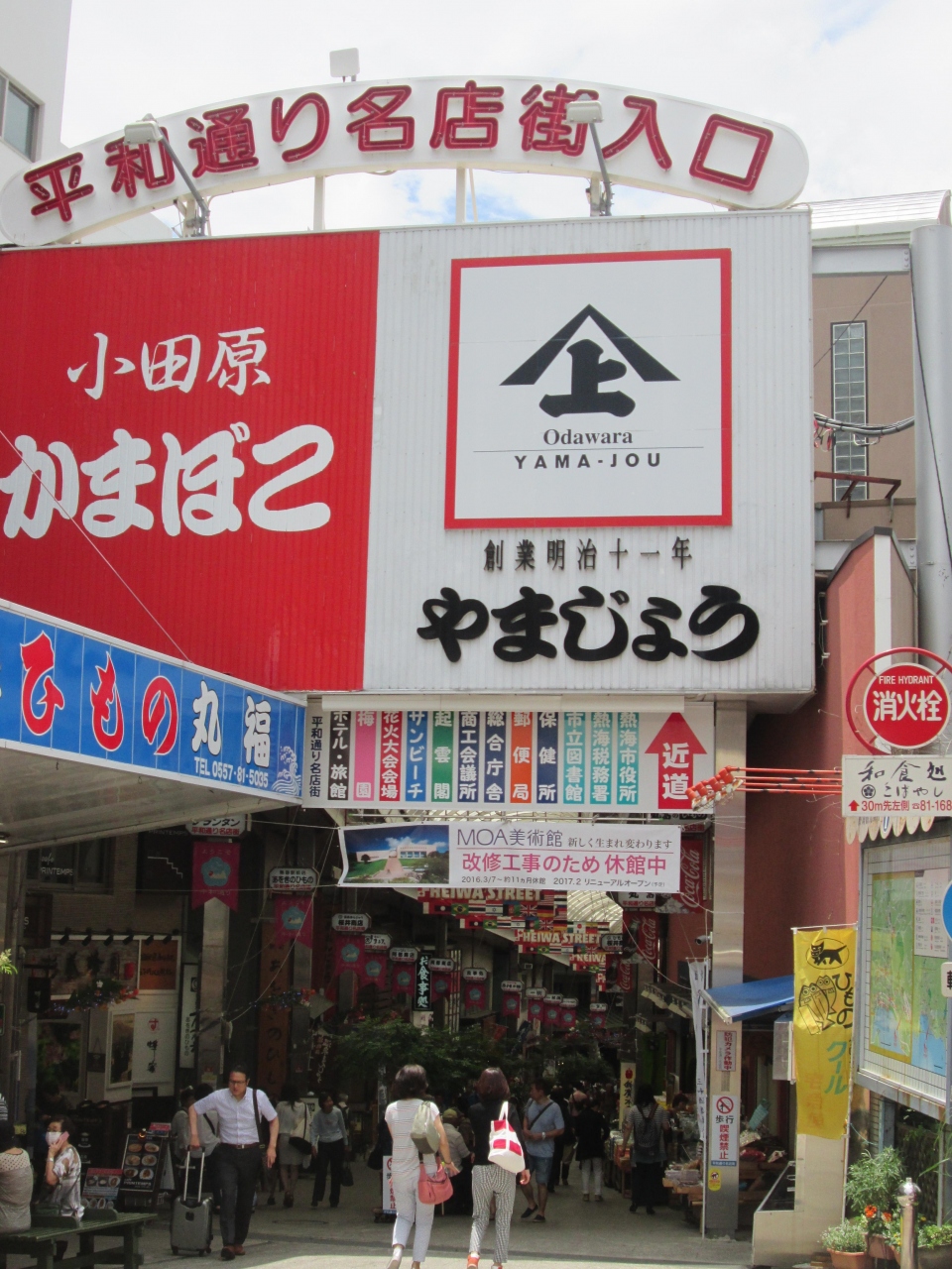 JR熱海駅前から海岸方面に行く時通るアーケード街で、仲見世商店街と並行しる通りです、駅前の小田原かまぼこやまじょうの大きな看板の下から商店街になります、ひものや海産物・温泉饅頭中心のお土産屋、食事処のお店が中心です、中に手湯の福福の湯や夢かけ地蔵があります、郵便局もありました、商店街奥には伊東園ホテル熱海館もありました。