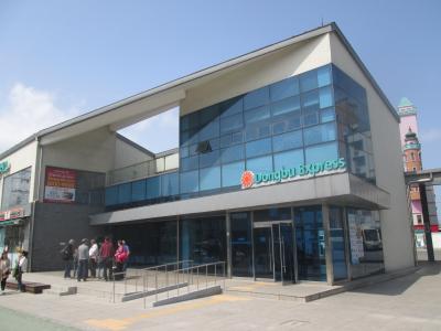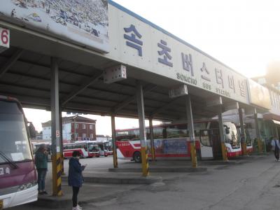 ソウル高速バスターミナルから高速バス利用で約2時間40分で行きました、場所は束草市街の南側にあり、隣接して観光案内所があります、ちょっと歩くと束草ビーチ・海岸が、Eマートも近くにありました、宿泊施設は周辺に多くあります、市街バスの停留場はちょっと歩きます。