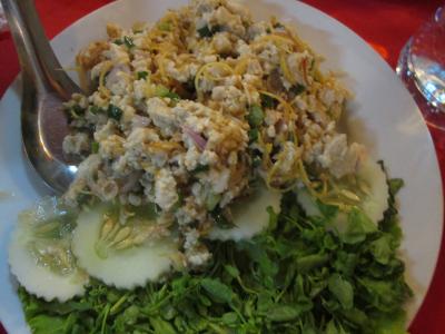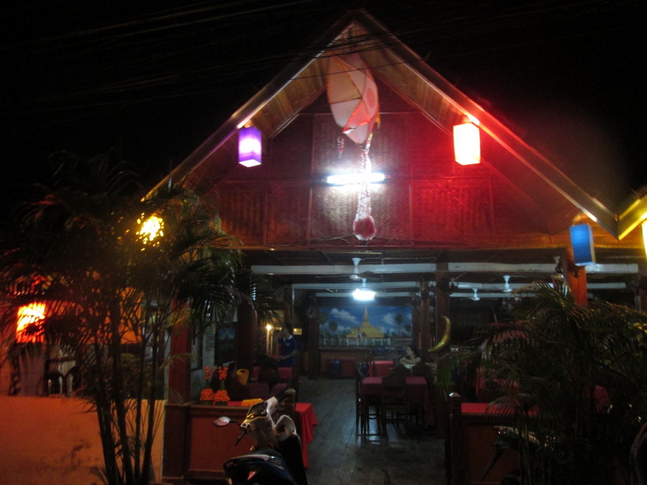 ラオスのルアンパバーンに来て初めてここでラオス料理を食べました、市街地のほぼ中心、シーサワンワッタナー通り沿いソティクンマーン通りとの角にあるラオス料理のレストランで良心的価格で出されたラオビールを飲みながら食べました、手造りの竹籠に入ったご飯などほぼ満足の味でした、ビールの値段は安かったです。