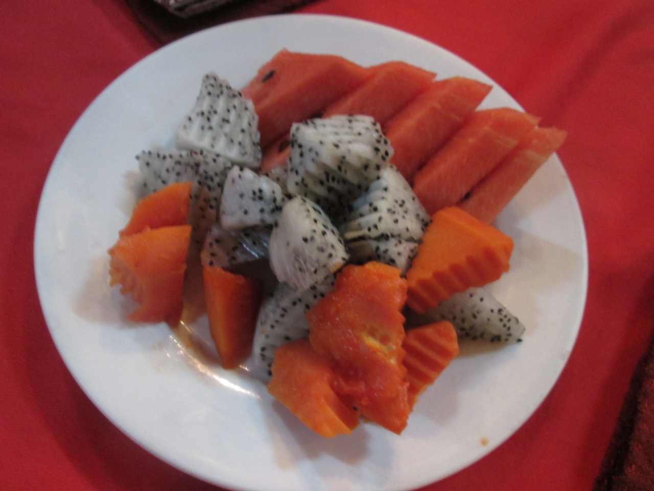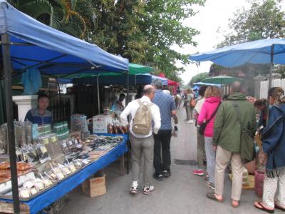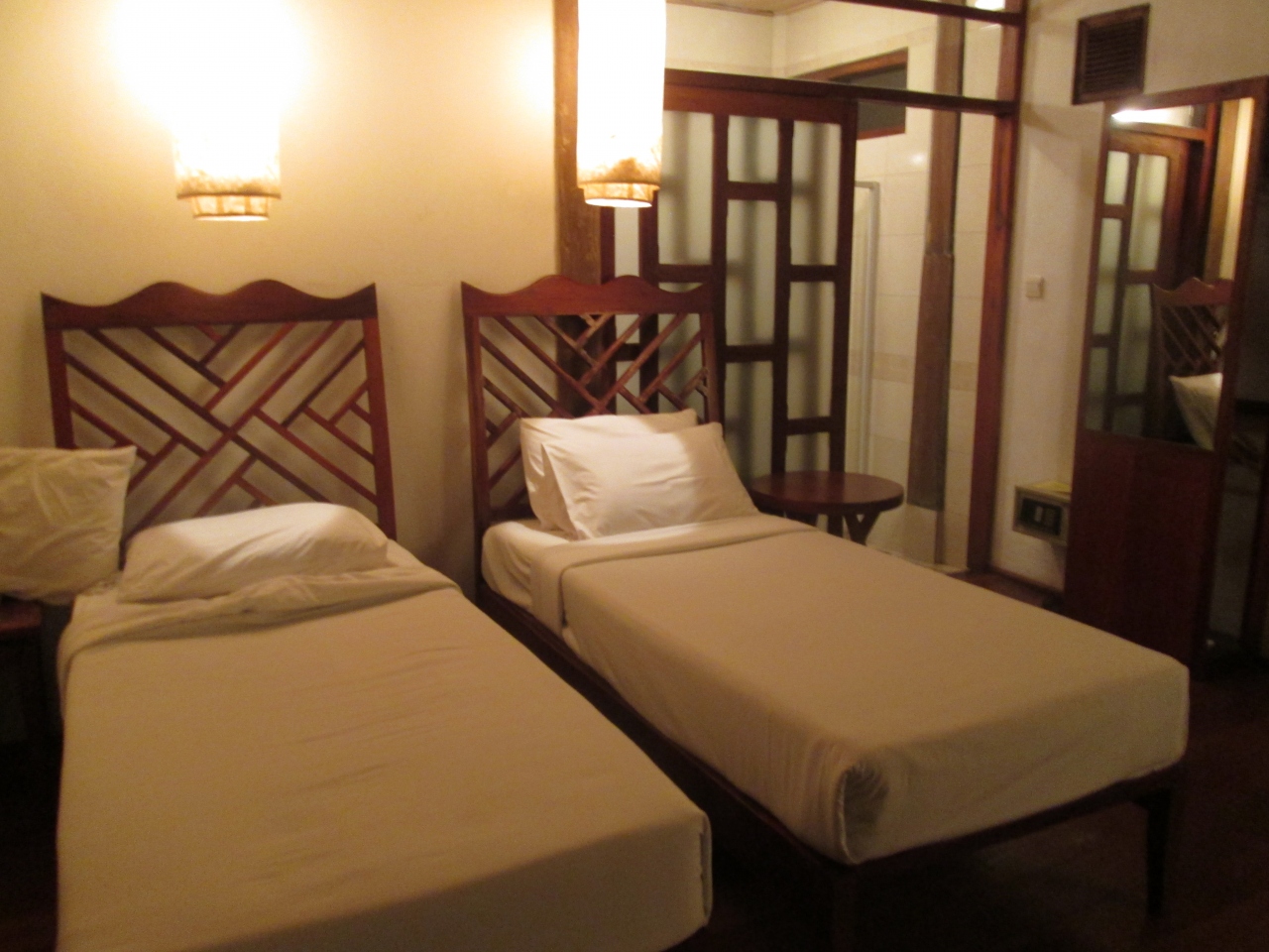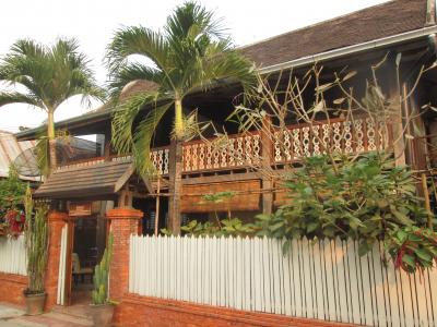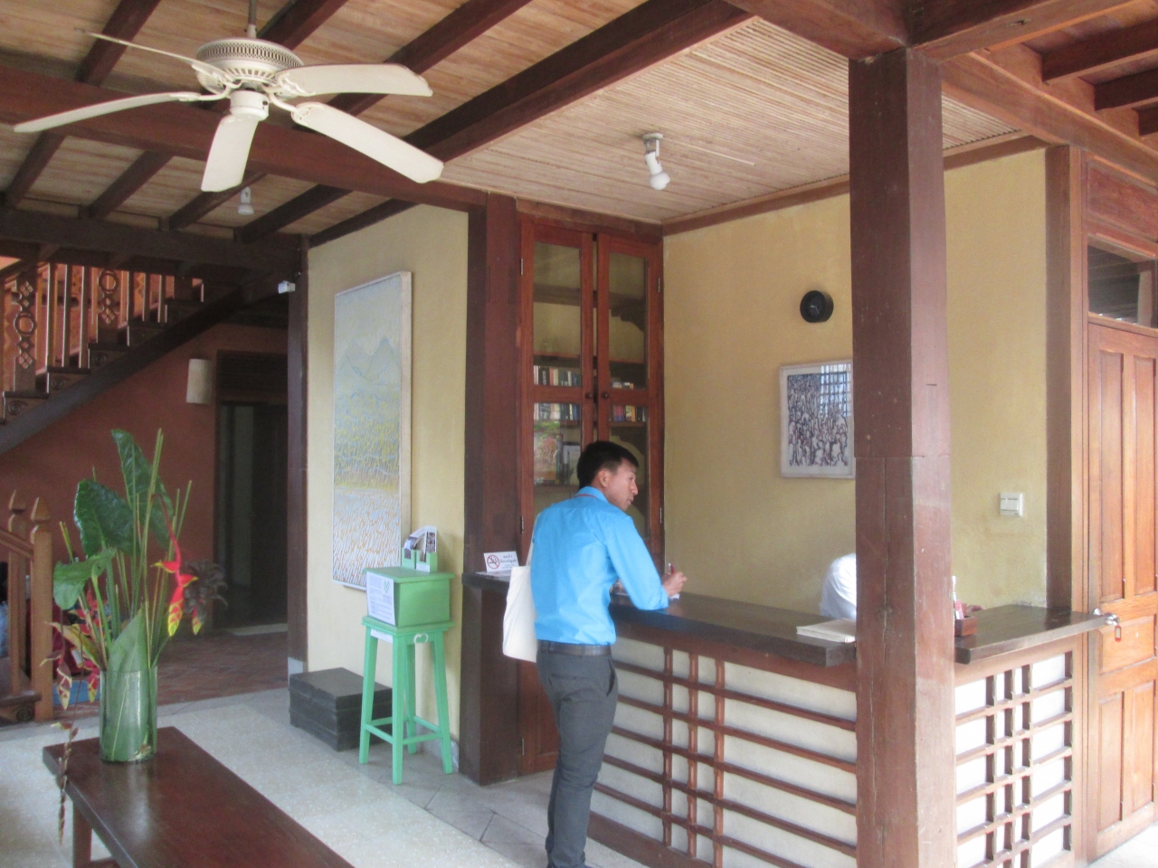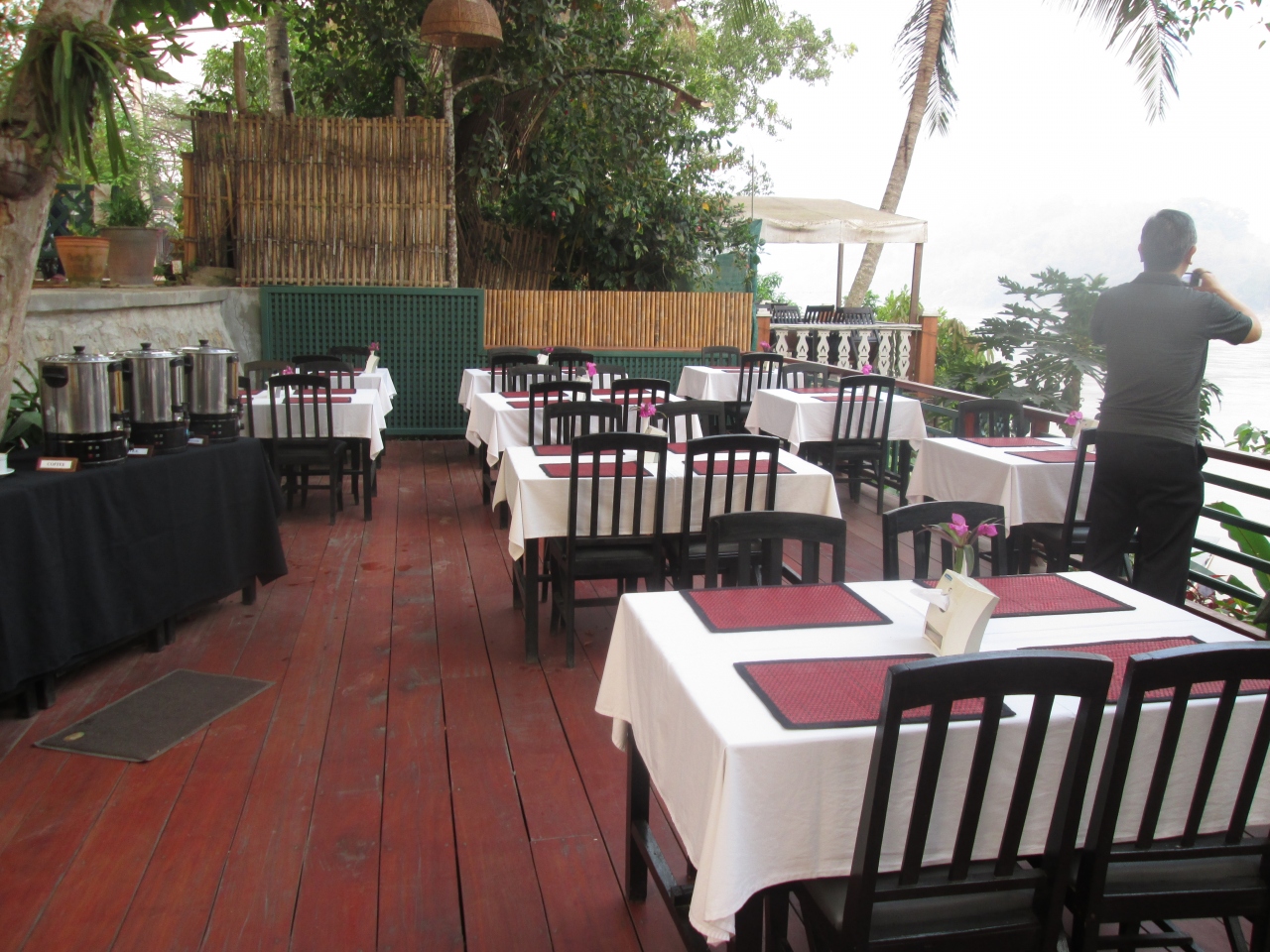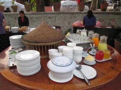 本館はメコン川沿いにありますが別館は一本中に入ったソティクンマーン通り沿いにあります、静かな場所で木のぬくもりが感じられるクラシックな建物でした、広くはないですが2人でも十分でした、朝食は本館前のメコン川沿いで食べることができます、メコン川を眺めながらビュッヘ形式で、パンと玉子はその場で焼いてくれました。