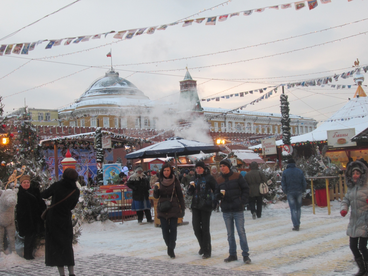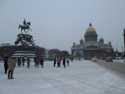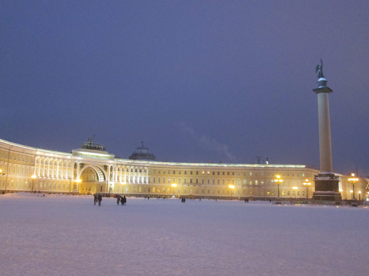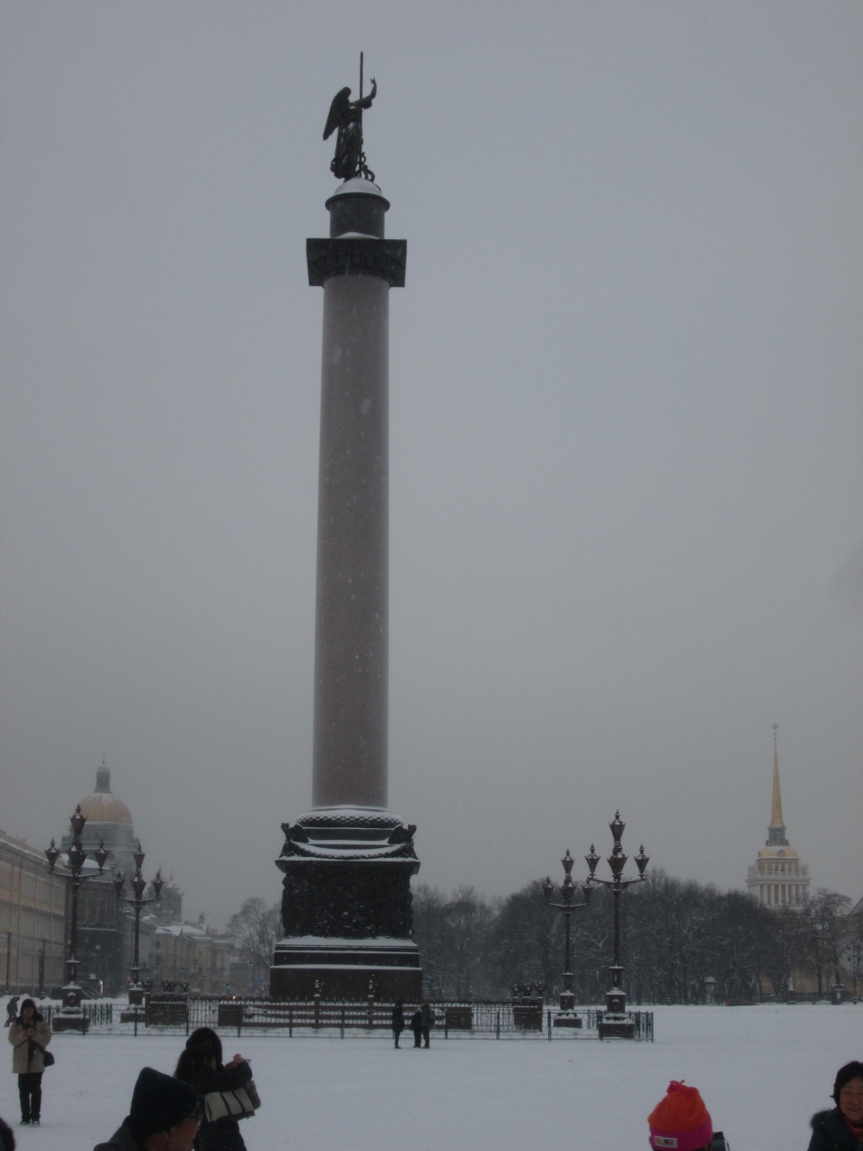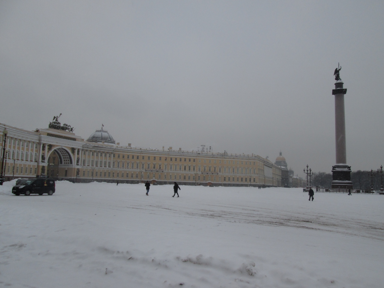 エルミタージュ美術館を見学するためバスで宮殿広場に到着、大きな広場でエルミタージュ美術館と旧参謀本部に囲まれています、見学時には広場内を歩くことになります、広場内にはアレクサンドルの円柱がそびえ立っています、冬でしたので人はいない静かな広場でした