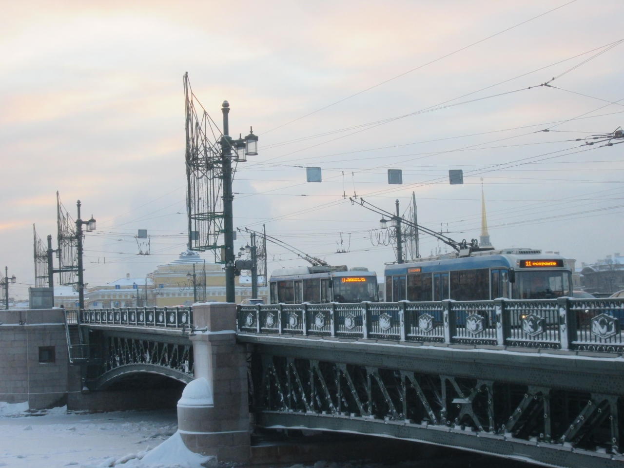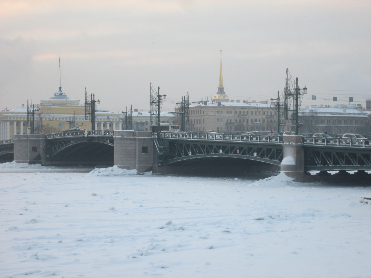 宮殿橋際にバスを停めて周辺を眺めました、大ネヴァ川に架かる橋で南側には旧海軍省とエルミタージュ美術館があり、北側には動物学博物館やロストラの燈台柱があります、ここからペトロパヴロフスク要塞など見ることができます、この橋は跳ね橋で夜間に船を通すため開いて起き上がるようです。