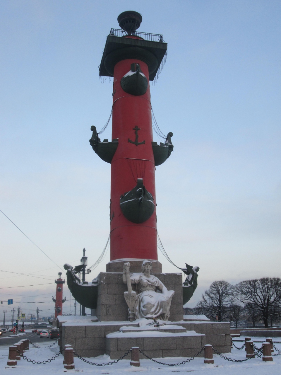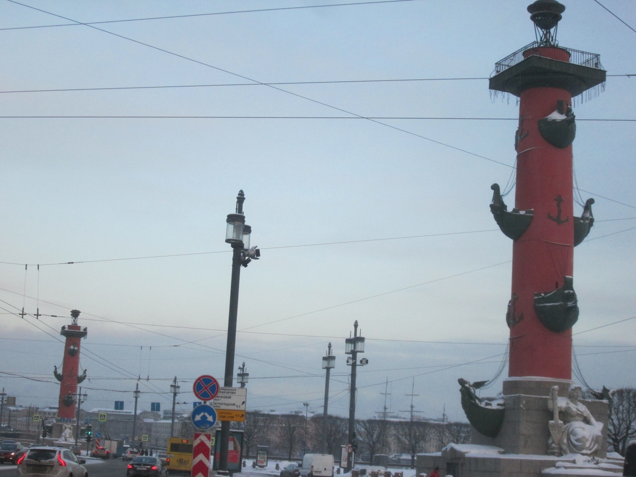 ネヴァ川に架かる宮殿橋際にバスを停車して行きました、ヴィアシリエフスキー島の岬にあります、燈台柱は2か所あり、証券取引所広場の宮殿橋近くと証券取引所橋近くにあります、赤く塗られた高さ32m円柱で遠くからでもよくわかります。