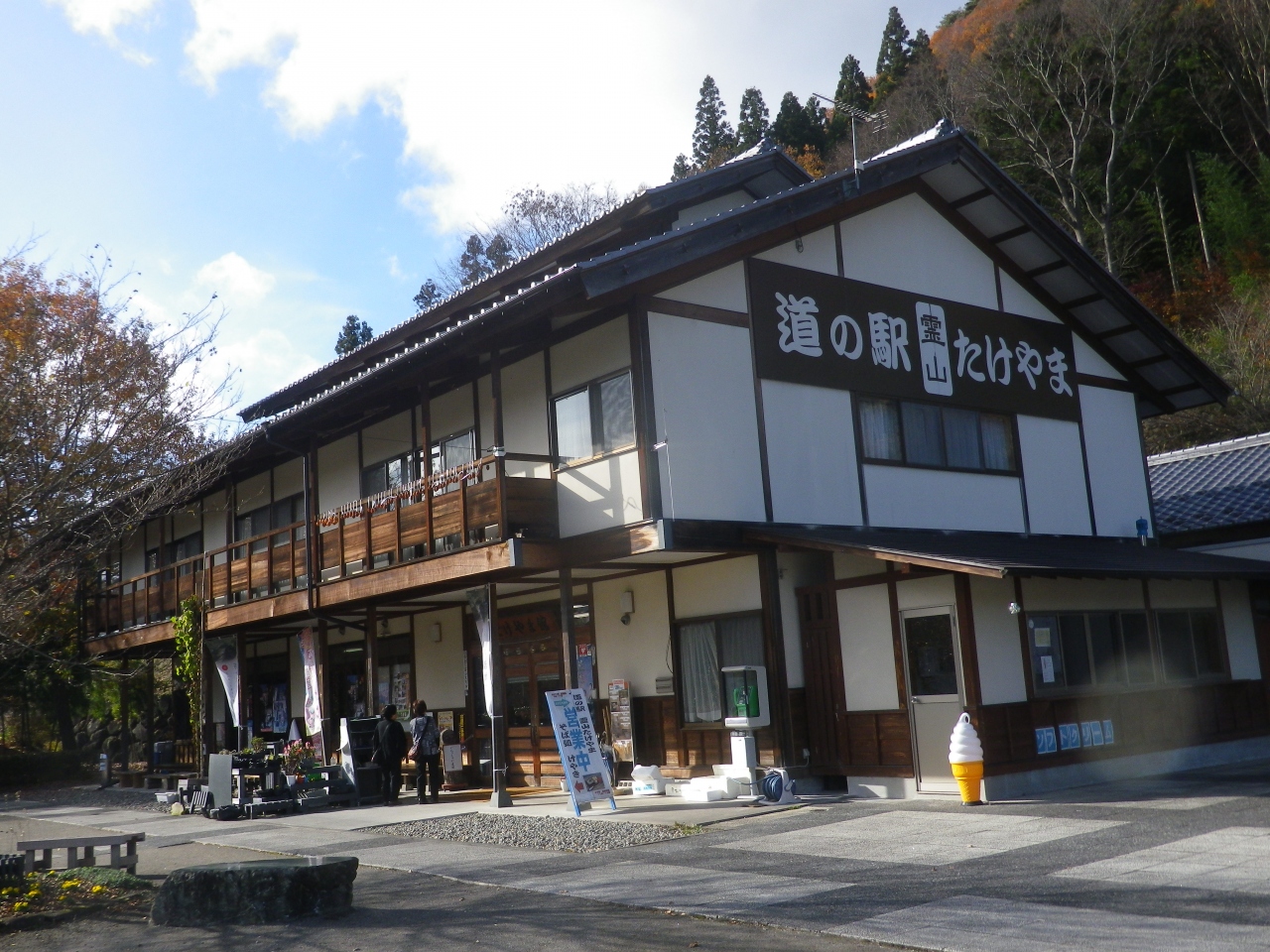 中之条町の市街地北部にある標高789mの岩肌が見える嵩山の山麓にあるのが道の駅霊山たけやまです、嵩山への登山口もあります、施設として地元産の物産・農産物が販売されている物産販売コーナーや十割そばが食べられるそば処けやきがあります、又、そば打ち体験教室もあります。