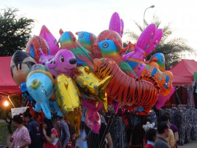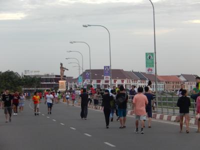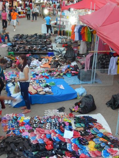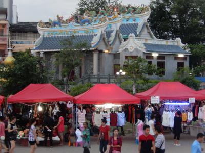 市街地のメコン川沿いの道路、ファーグム通りとメコン川の間にある公園・広場で毎日夕方から行われているナイトマーケトです、マーケット内には衣料品・履物・小物・食品などのお店が多くあり賑わっていました、お店を眺めて楽しみました、堤防沿いの道路は歩行者専用になっていて多くの人が散策していました。