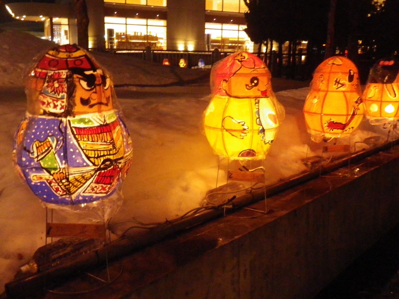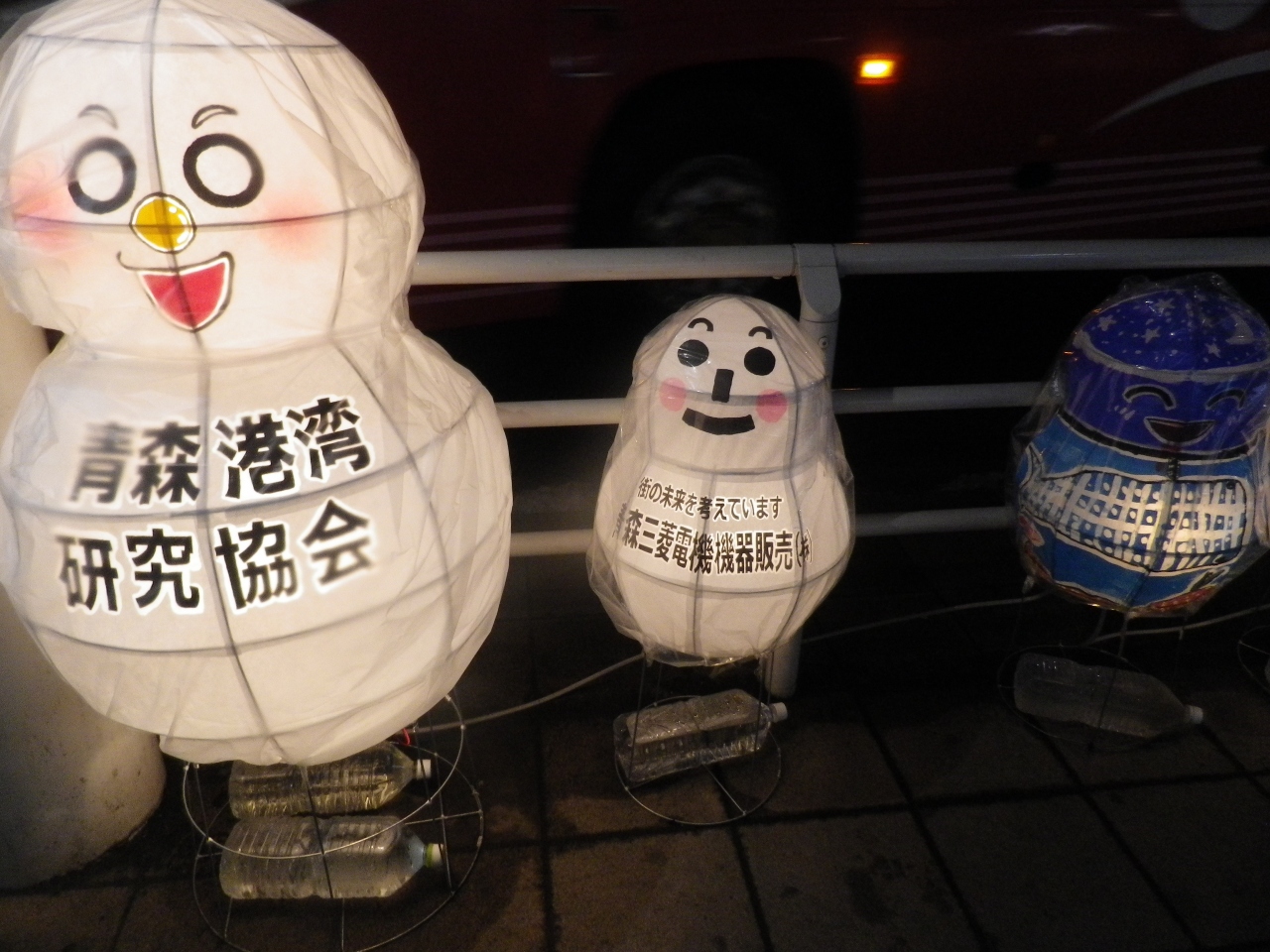 青森駅のそばにあるA-FACTORYとアスパム間で冬の1月終わりから2月いっぱいまで実施されている「あおもり光のファンタジー」のひとつ、夜になると紙で出来た大小のぼんぼりに灯りが灯り楽しめせてくれる、無料で見物でき夜は21時まで見ることが出来る