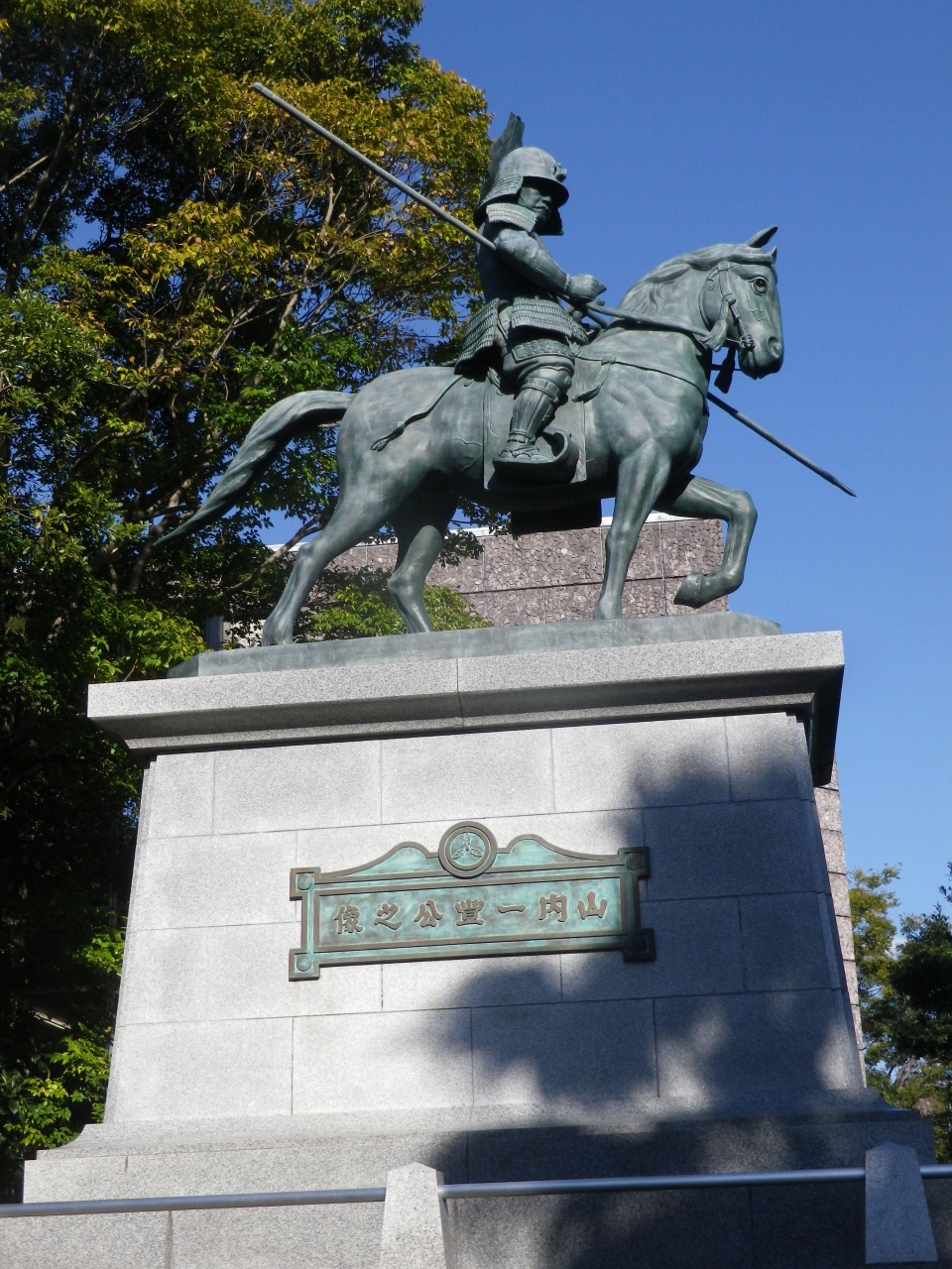 高知城の表門である追手門がある追手門広場の高知県立図書館前にあります、土佐藩の初代藩主である山内一豊の銅像は平成8年(1996年)9月20日、一豊の祥月命日に再建除幕されました、ブロンズ鍛造青銅色仕上げで高さ4.32m、総高9.4mあり、騎馬像としては国内最大クラスです。
