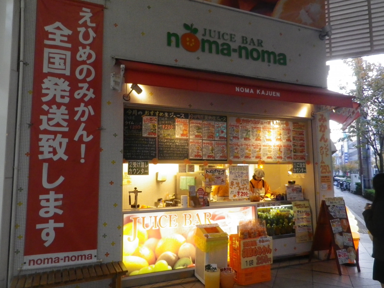 松山市の代表的商店街である、アーケードがある大街道商店街の中ほどにあります、愛媛といったらみかんですが、そのみかんの生ジュースをその場でジュースにして飲ませてくれるのがnoma-nomaです、秋から冬にかけては新鮮なみかんジュースが飲めます、ジュースの他、みかんなど果物の販売もしています。