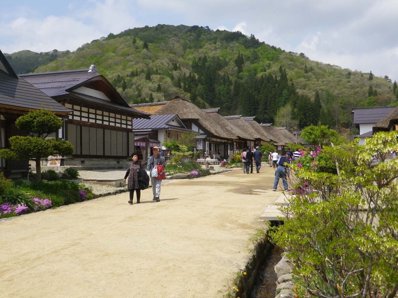 会津の代表的観光地です、下郷町の下野街道(会津西街道)の宿場町で江戸時代の雰囲気が残る茅葺屋根の民家の街並みが残り、現在は、お土産屋や飲食店として営業していますので多くの観光客が買物・飲食を楽しんでいます、バスツアーのコースとしても人気があるので、平日でもツアーで来た観光客がたくさん歩いています。