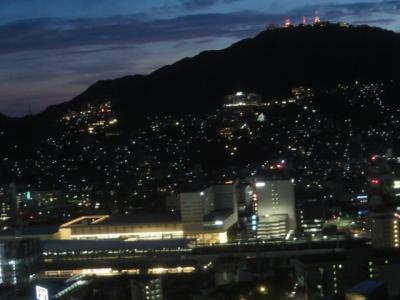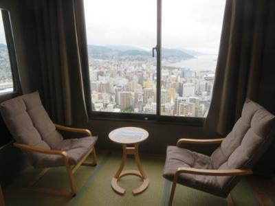 長崎駅の北東にある高台・立山にある観光ホテル、1泊朝食付きのお得なプランを利用して宿泊しました、眺望が楽しめること知られています、夜景も素敵でした、大浴場からも良く見えます、長崎港、女神大橋、造船所、稲佐山など良く見えました、朝食は和定食で良かったです、行きは路線バスで行きましたが帰りは墓地の中を歩いて駅前まで行きました、ホテルのそばにはコンビニや飲食店はないです。