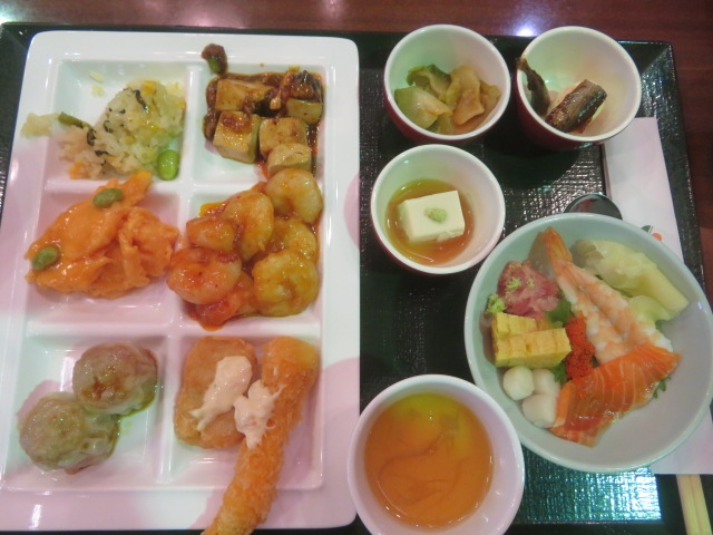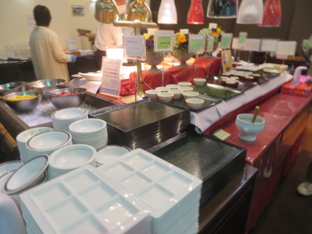 食事はオリエンタルガーデン1階にある万里で夕食・朝食ともバイキングでそこそこの料理があり、ほぼ満足でした、私の好きな中華料理がメインでした。