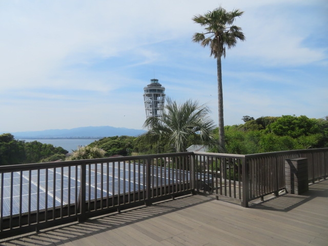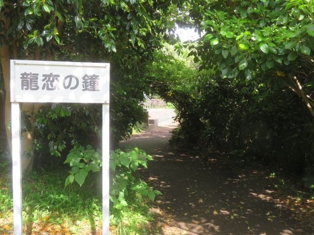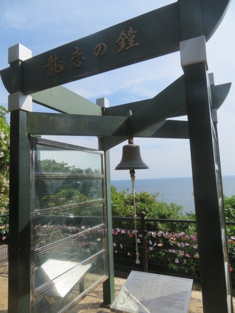 江の島の奥にある江島神社・奥津宮前から行きました、龍野ヶ岡自然の森の一角にあり、相模湾や伊豆大島を見ることができます、龍恋の鐘は江ノ島に残る天女と五頭龍の恋物語にちなんで1996年に造られた物で多くの若者やカップルが訪れて鐘を鳴らしています、又、フェンスには南京錠がたくさんありました、多くの人が来ている江の島の中で人は少ない場所です。