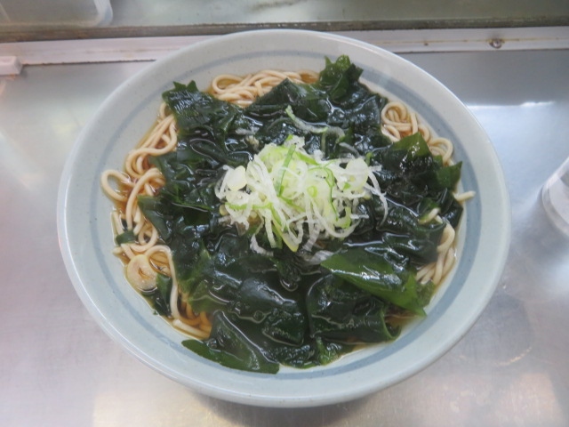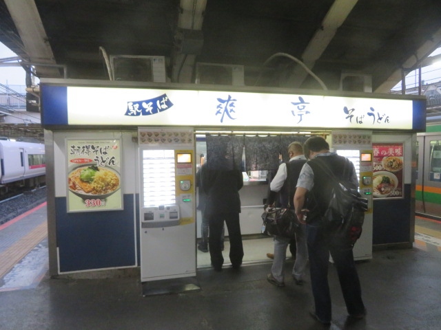 上野駅、上野東京ライン、常磐線の特急が発着する7.8番ホーム上にある立ち食いそば店です、名古屋のきしめん店・住よしを運営するジャパン・トラベル・サーヴィスが経営の駅そば店で入口の券売機で食券を購入して食べます、店内は狭く、カウンター席のみ5~6人で満席になります、好きなわかめそば(370円)を食べました、味は普通でした、そばの他にカレー丼があります。
