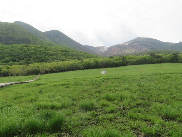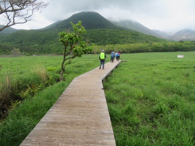 くじゅう連山の北側(標高1000m付近)、飯田高原・長者原ビジターセンターに隣接した場所にある広大な湿原です、平成17年に保護すべき重要な湿地として登録されました、整備されて歩きやすい自然研究路(木道)をくじゅう連山を眺めながら歩くといいです、湿原の植物が群生しています、長者原の広い駐車場から1時間位歩いて自然を満喫しました。