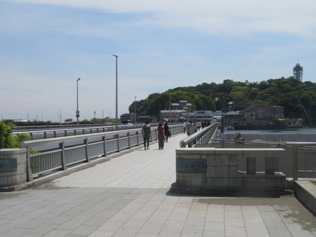 小田急・片瀬江ノ島駅や江ノ電江ノ島駅から江の島に行く時に渡る橋です、江の島大橋は車道で江の島弁天橋は人道橋です、ここに最初に桟橋がかけられたのが明治24年(1891年)で現在の橋は昭和32年(1957年)です、大橋は昭和37年完成で長さが324mあります、橋を渡りながら富士山を見ることができました、渡ると江ノ島の観光が楽しめます。